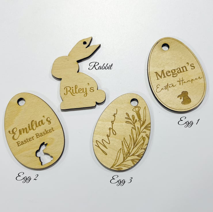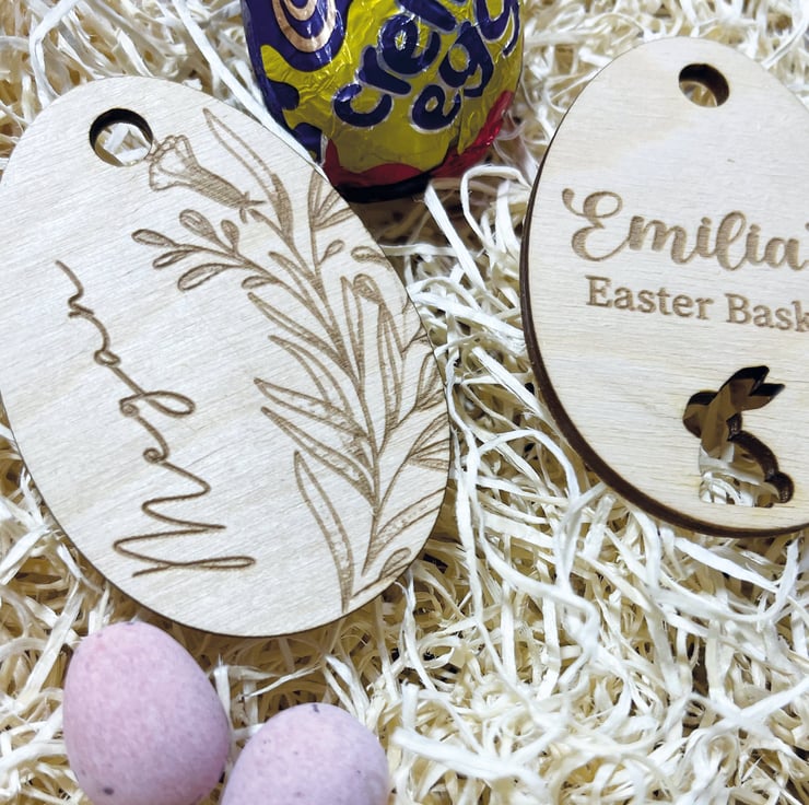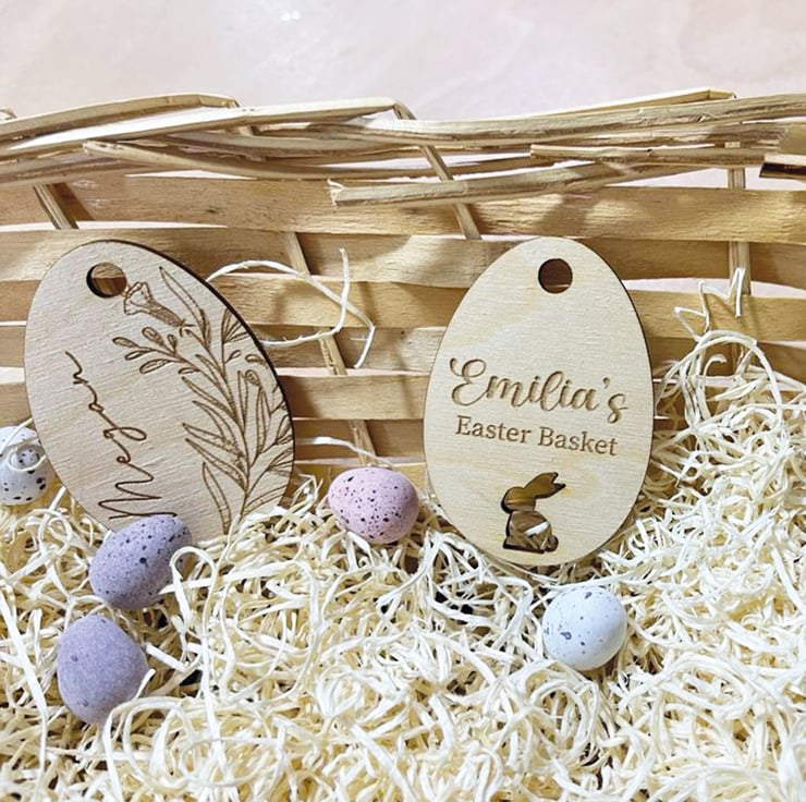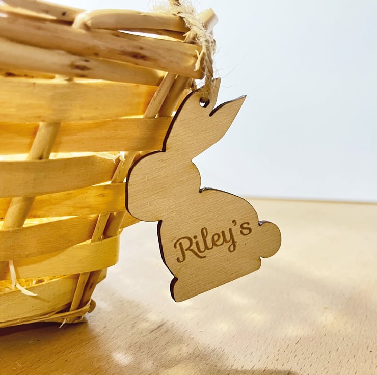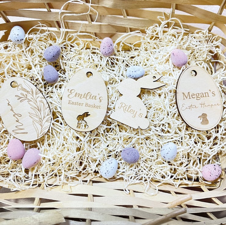 Wooden Easter tags that are a perfect personalisation to your Easter Hamper Basket.