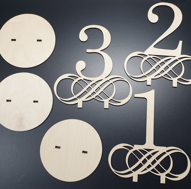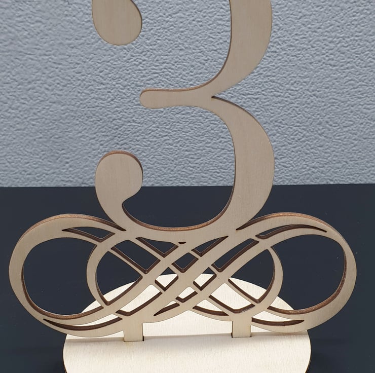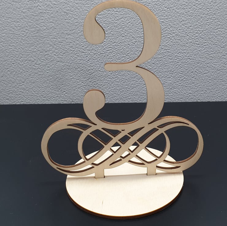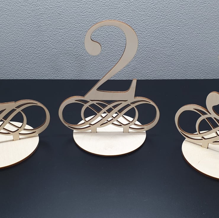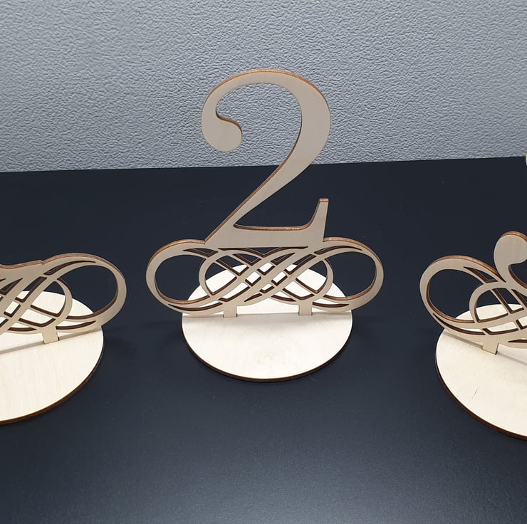Beautiful handmade table numbers, cut from a sold block of premium birch wood. For each 1 purchased you will receive the chosen number and a base to slot it into.