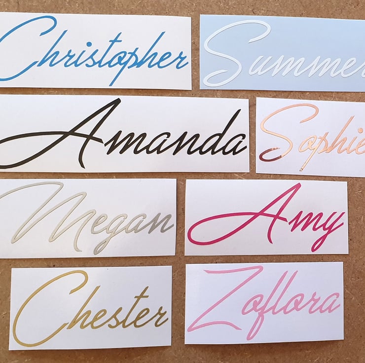 The Height of each sticker will be 3.75 cm and the width will vary on the amount of characters in your chosen nameword.