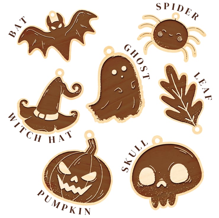 Ghost, Pumpkin, Skull, Witch Hat, Bat, Leaf, & spider