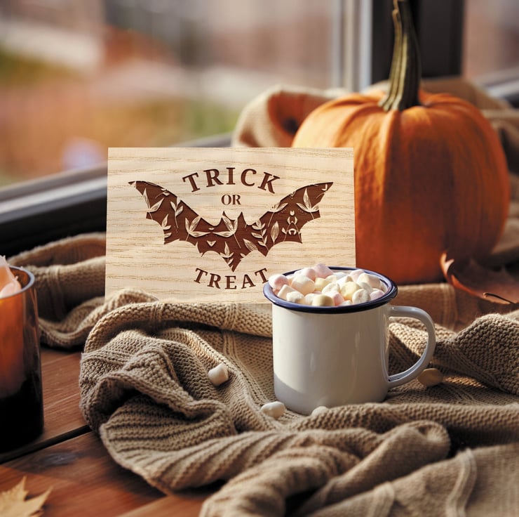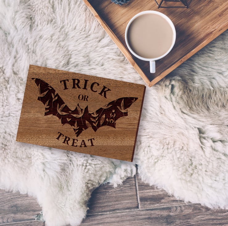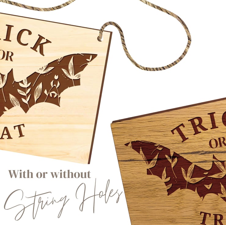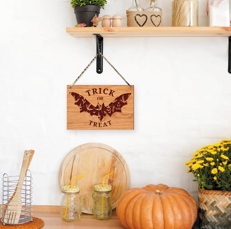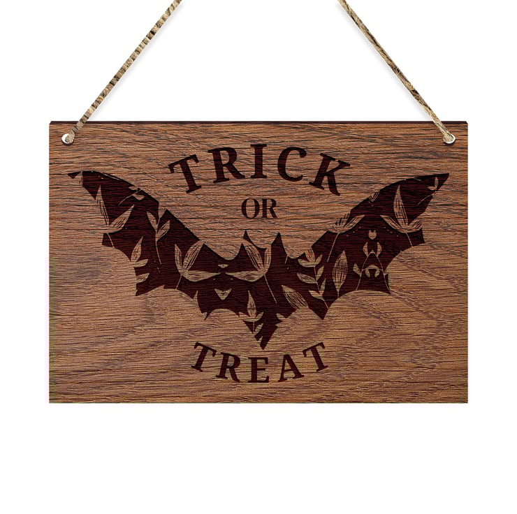 Elevate your home with this subtle Halloween 'Trick or Treat' sign. A modern decorative bat design, beautifully engraved on a wide selection of woods. These signs give off the ultimate cosy autumnal vibes.