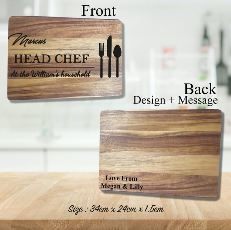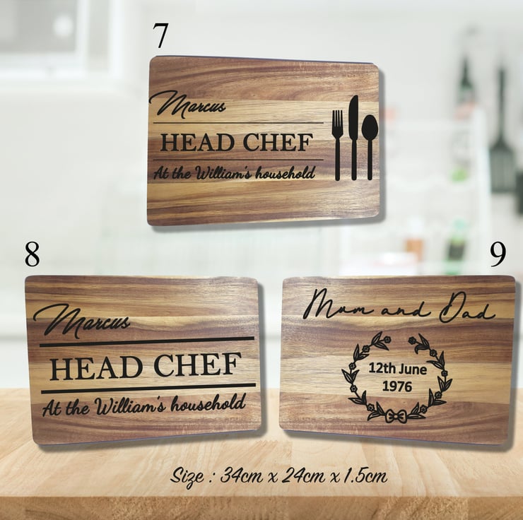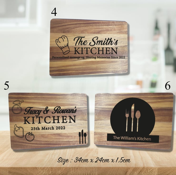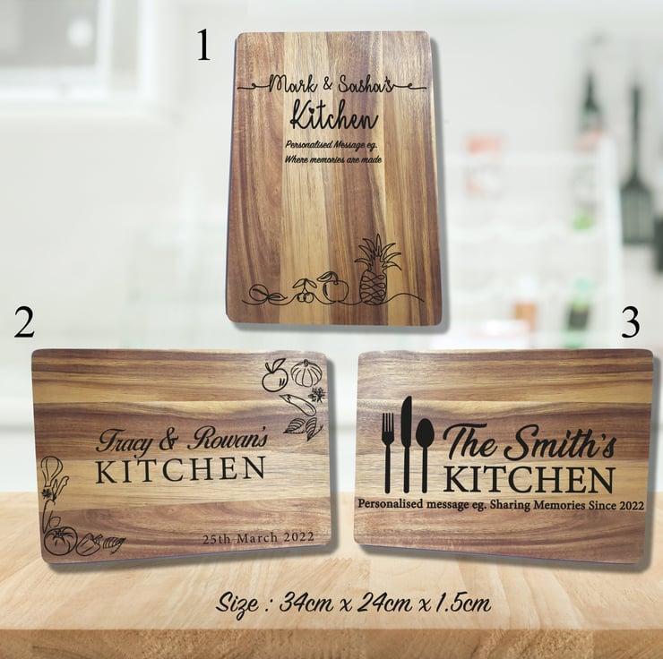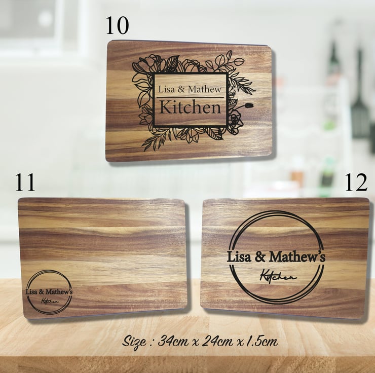 Beautiful personalised wooden chopping cutting board with 12 different designs. Suitable for many occasions such as Weddings, Housewarming, Birthdays. If there is a design in mind we do not have message us and we can make it into a reality.
