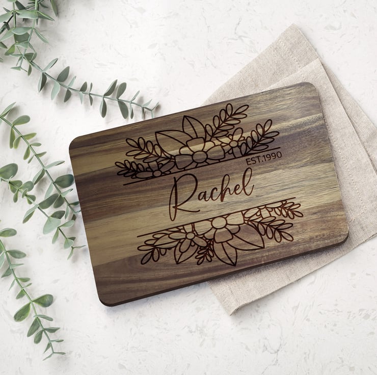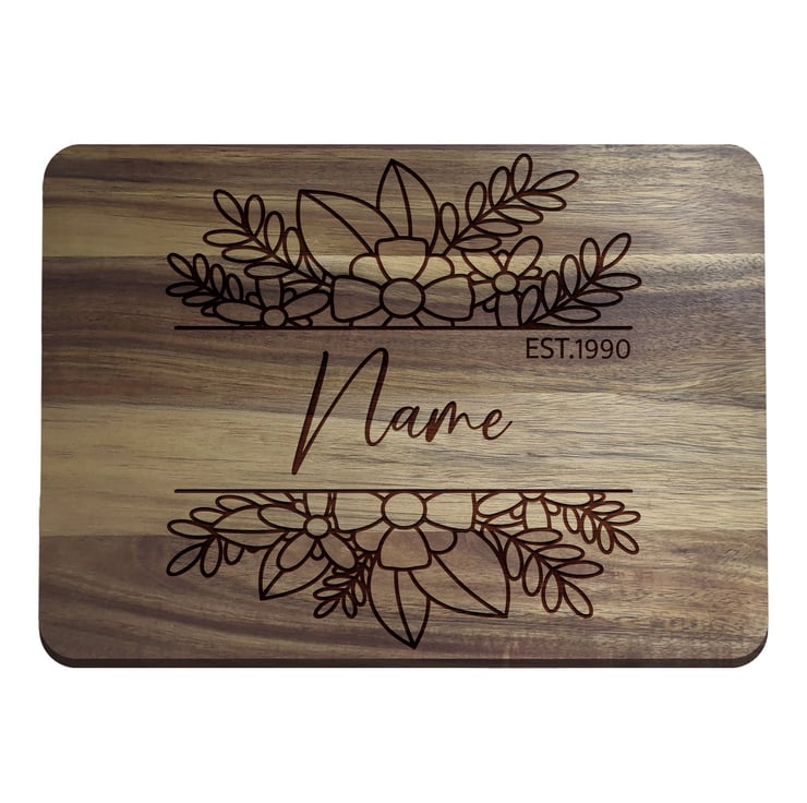 Personalised and beautifully engraved wooden chopping board. Add any nameword with an establishedBirth year to this cutting board and make an extra special gift for family and friends. With elegant floral illustrations, this design will make a lovely addition to any kitchen. Great as a Mother's Day, Birthday, housewarming, or Christmas gift!