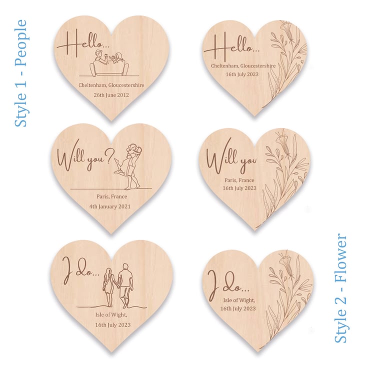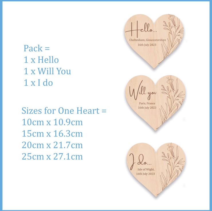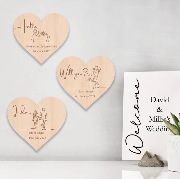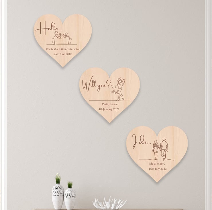 Beautiful personalised engraved wood 'Hello, Will You, I Do' heart-shaped plaque. Perfect wedding or anniversary gift.