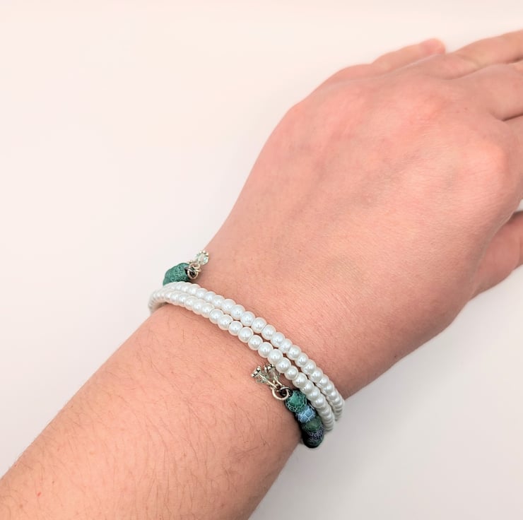 Beautiful green/teal frosted, crackled agate beads with faux pearls wrap bracelet, finished with tiny sparkly, pale green crystals.
