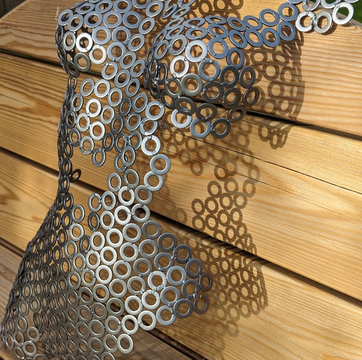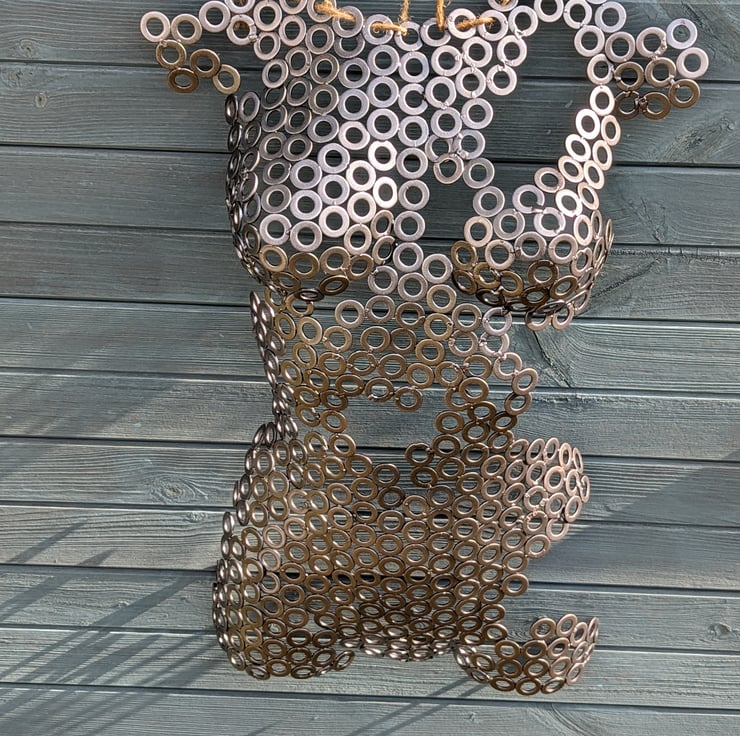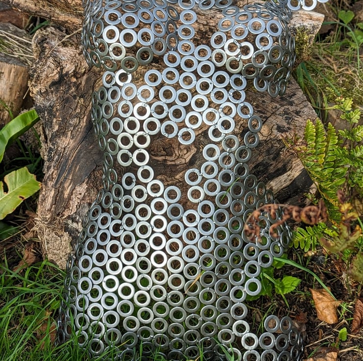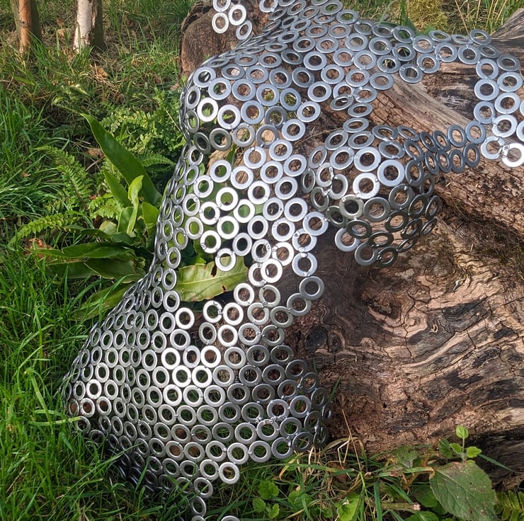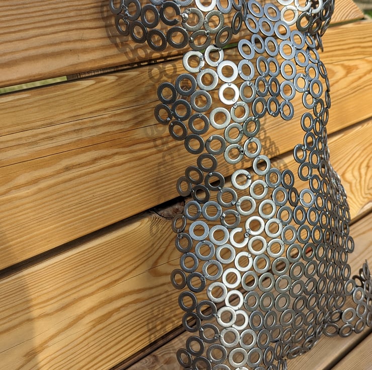 Handmade metalwork sculpture, made from 100's of washers being welded together and then powder coated in "metallic anthracite" powder. This colour has a beautiful gradient dependant on the light, being powder coated it is protected from the elements and so can be used inside or outside the house.