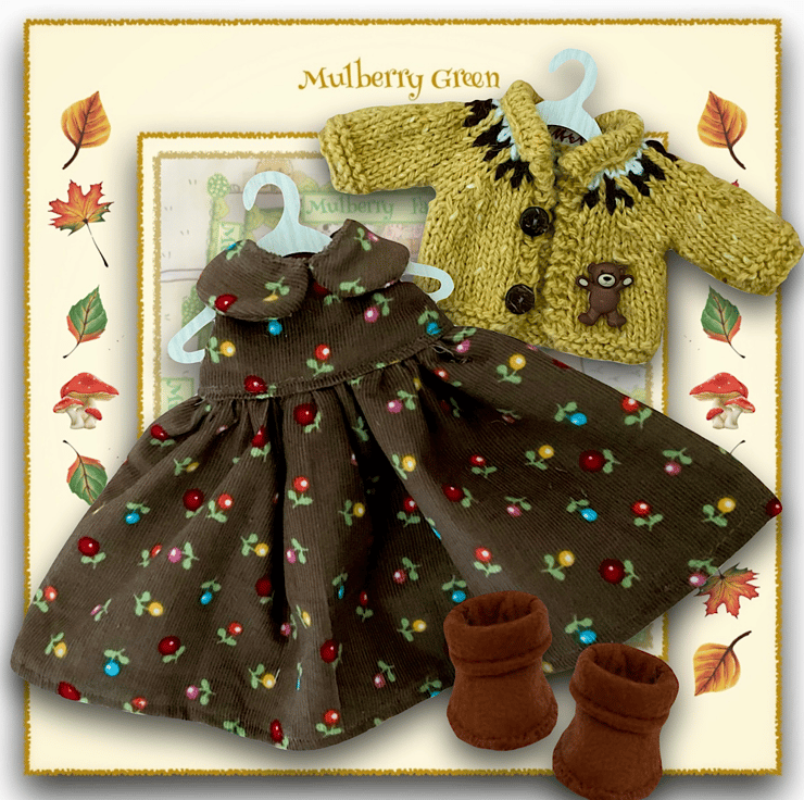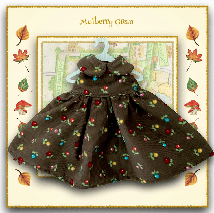 A gorgeous little soft brown corduroy dress in a colourful dots print to fit the Mulberry Green characters. The has a Peter Pan collar and a lined bodice.