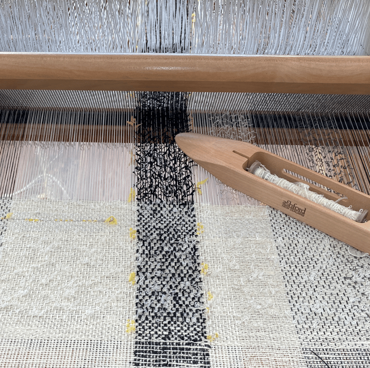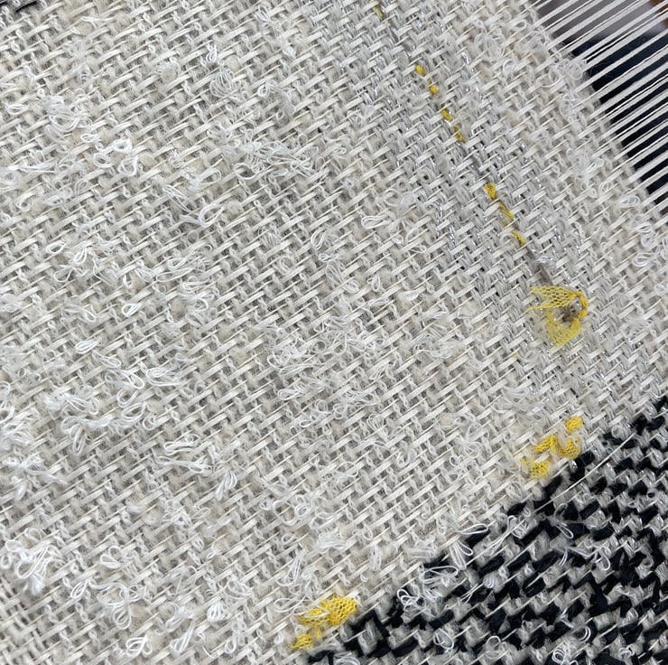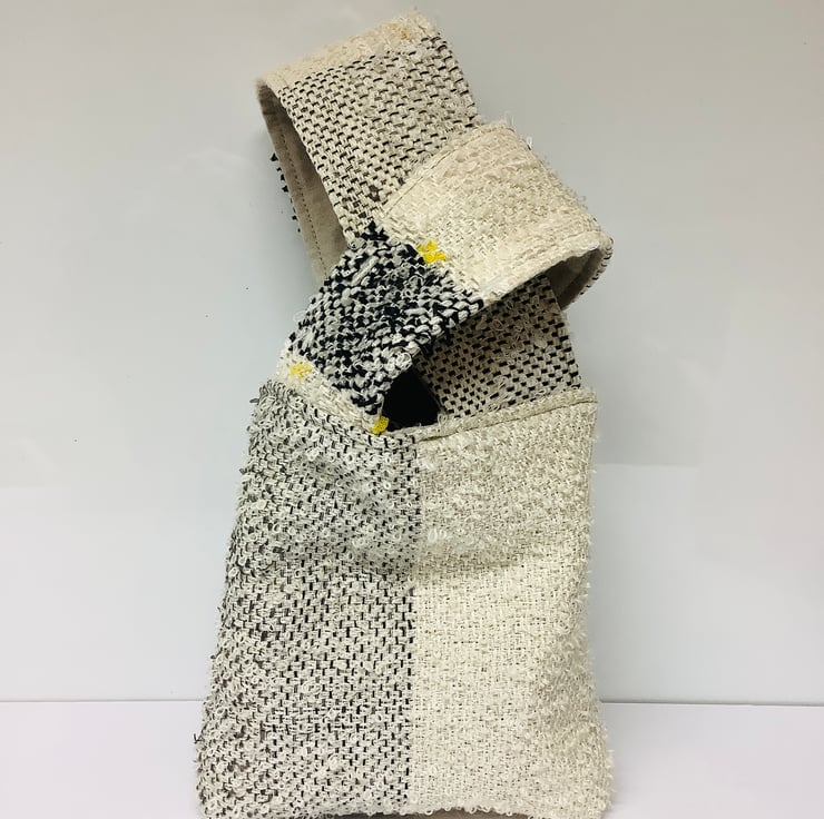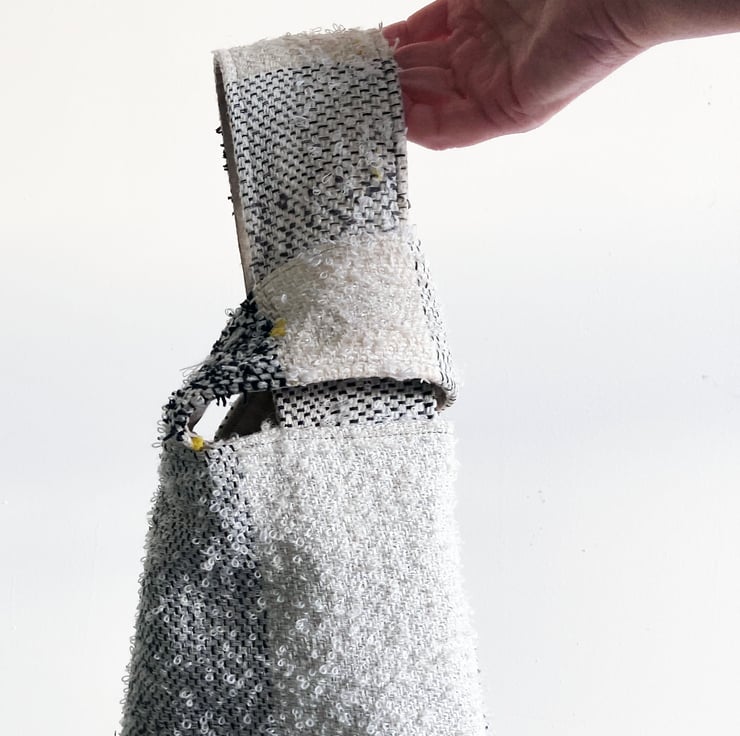 Handwoven knot bag, boucle textured tweed outer lined with taupe linen and an interior zip pocket. Handwoven exterior fabric features Japanese 'paper' (manila hemp) yarns in the warp with mohair and silk boucle yarns in cream and silver with pale yellow accent yarns in the weft.