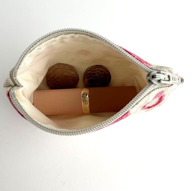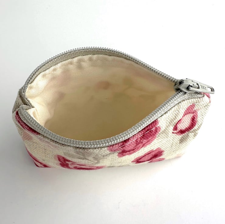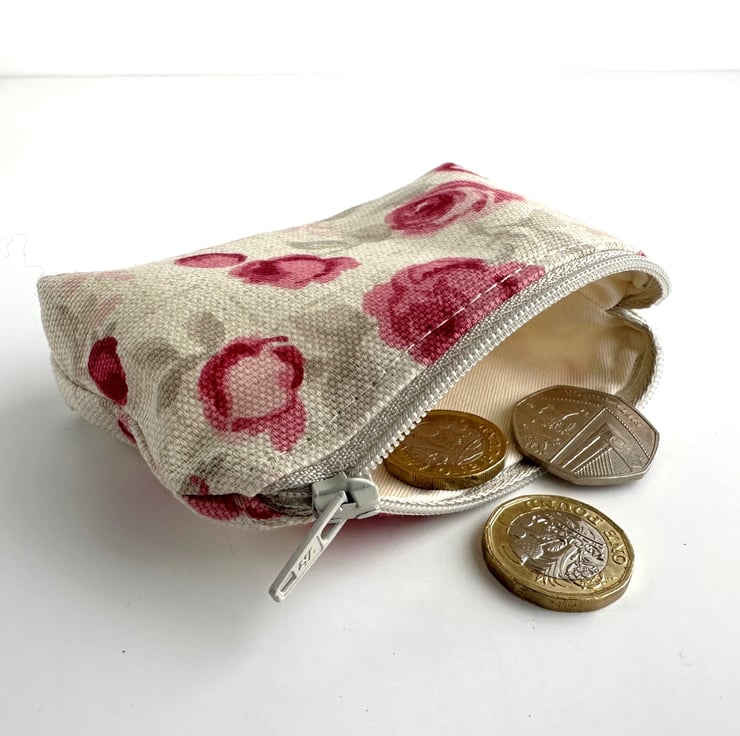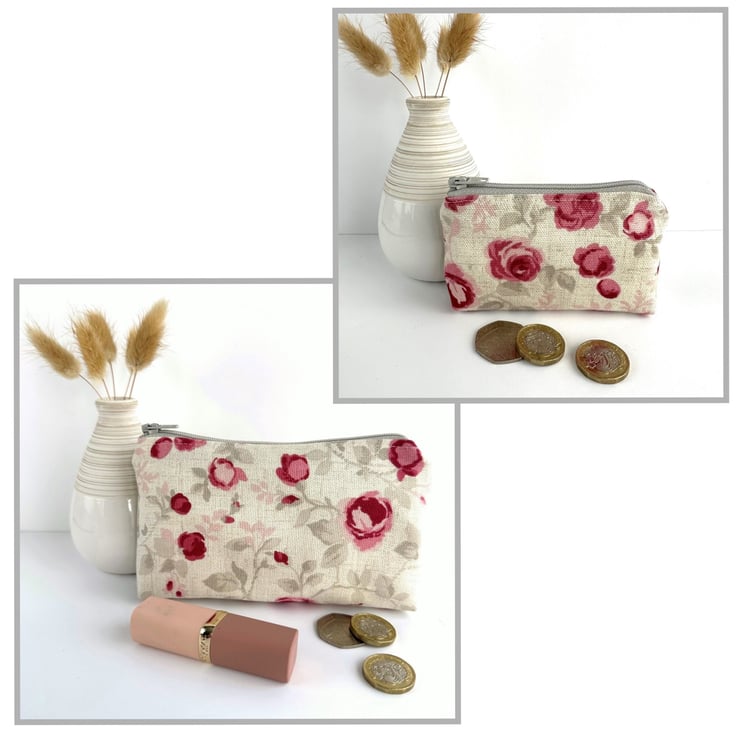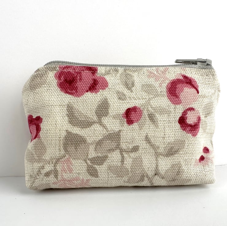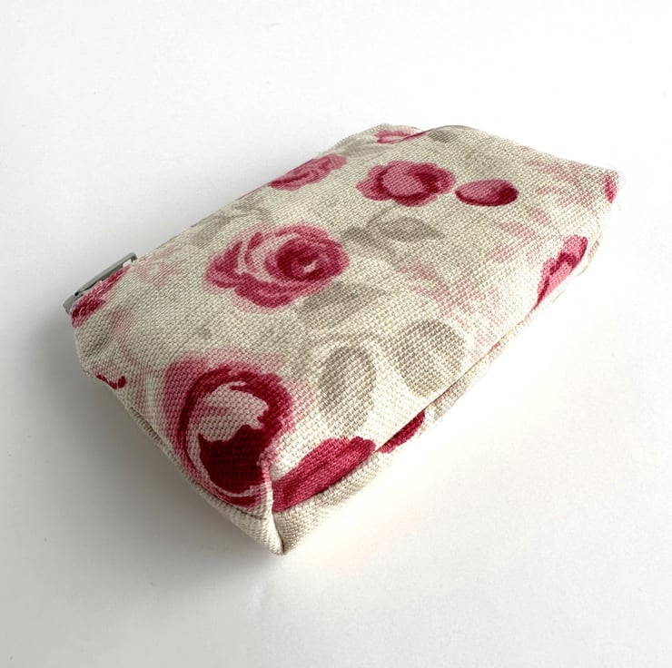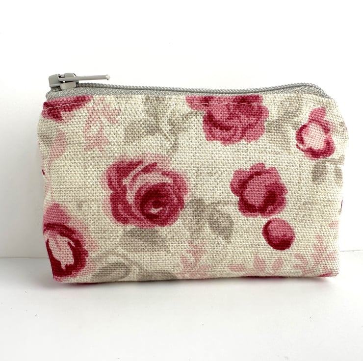 Small coin purse with small pink roses pattern. This pretty little purse is made from cream fabric with a floral print pattern featuring small pink and magenta roses amongst grey and pale pink foliage. The coin purse fastens with a matching pale grey zip and is lined with cream fabric. The base of the purse is boxed to give extra space inside.