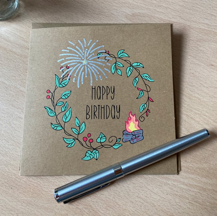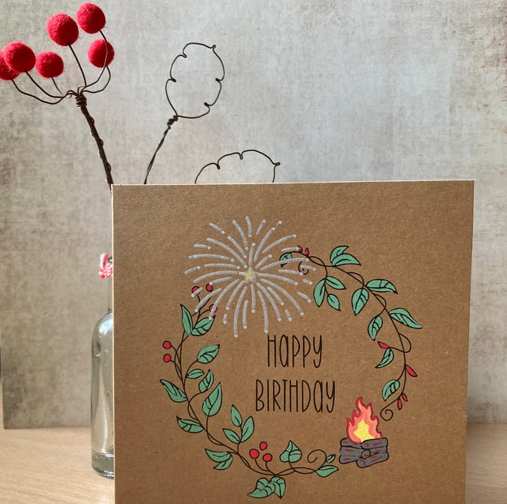 The perfect seasonal birthday card for those November birthdays, a circlet of green leaves with red berries, a bonfire and an exploding firework make this card wonderfully atmospheric. I have hand painted the details using bright acrylic based paints, and metallic marker.