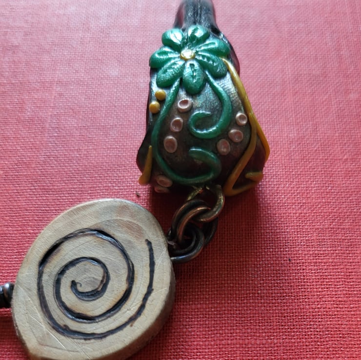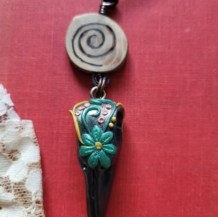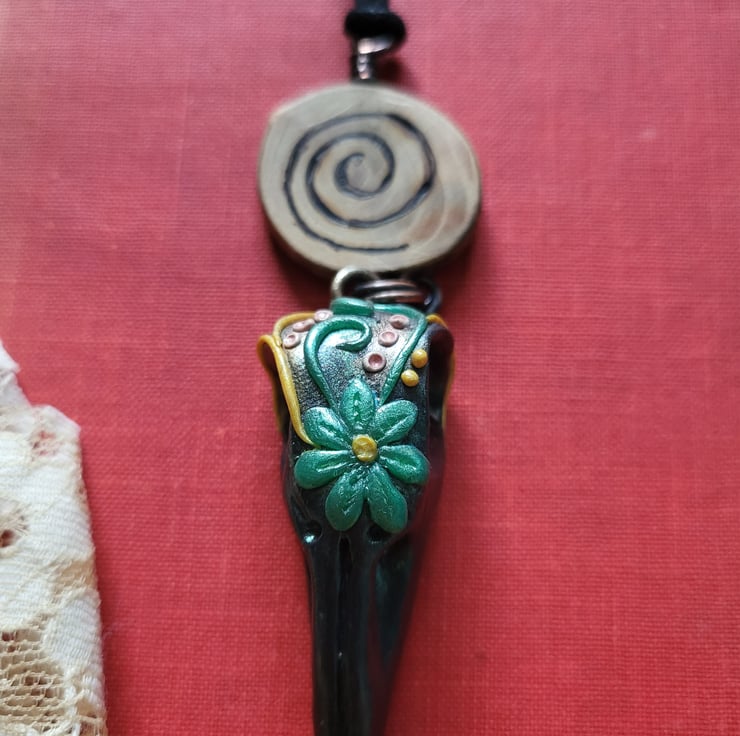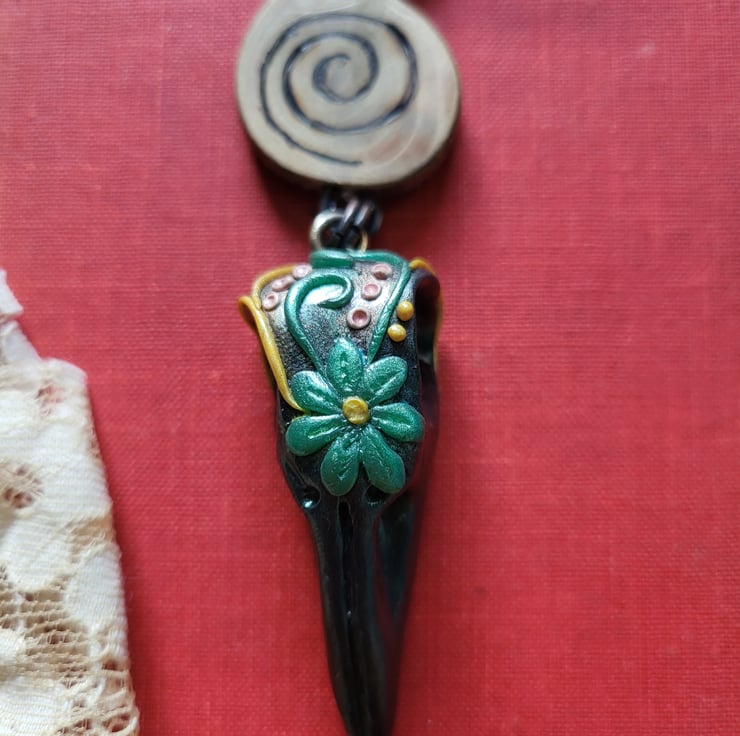 Discover the charm of my delightful wooden pyrograph spiral necklace. Crafted with care, this unique piece showcases a beautifully handcrafted fimo clay crow head charm. Suspended elegantly on a black cord, this necklace adds a touch of whimsy and style to any outfit. Embrace your individuality with this one-of-a-kind accessory that blends the beauty of nature with artistic craftsmanship.