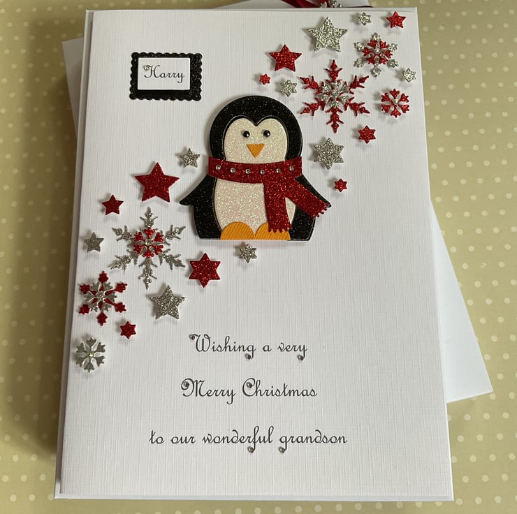 This handmade personalised Christmas card is A5 in size ( 210mm x 150mm) and is on 300gsm heavyweight linen card. The card can be personalised with a name of your choice at the top and the text underneath the penguin can also be personalised for you.
