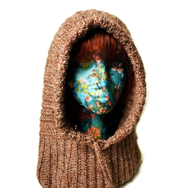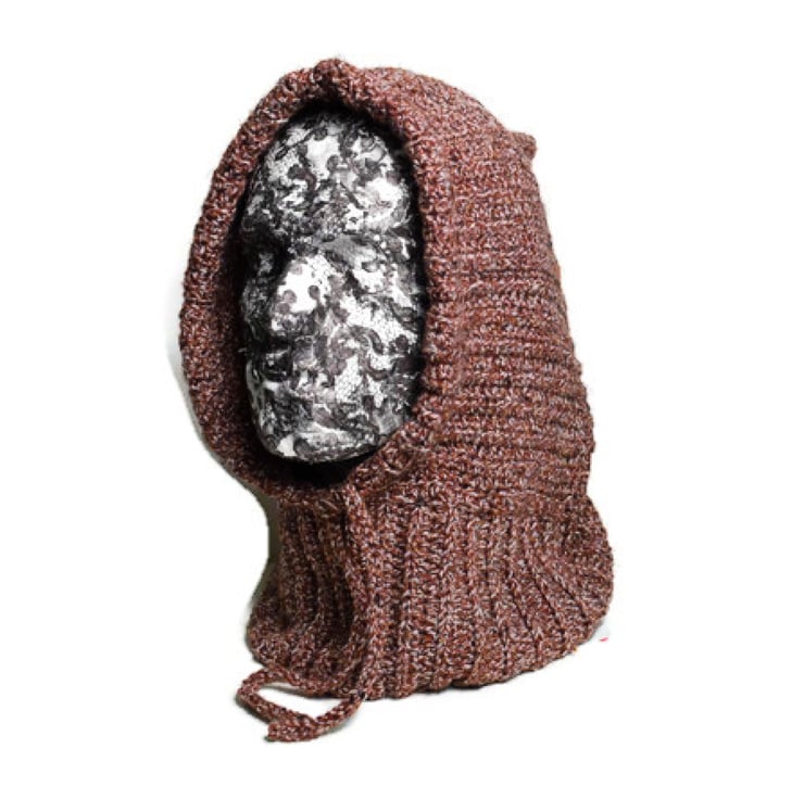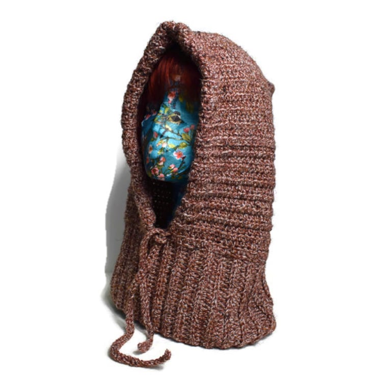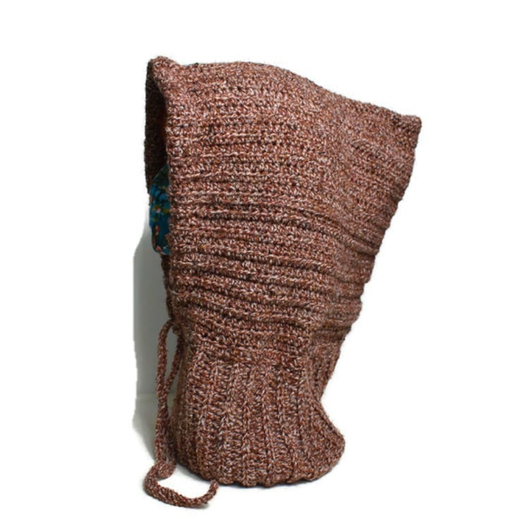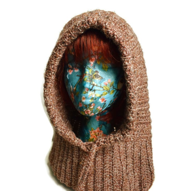 This balaclava style hat has been crocheted in an acrylic and wool blend yarn in this great tweedy look brown colour. It is unisex and would be a great way to not only keep your head warm but also the back and front of your neck too as the cowl section of this hat will sit inside your collar giving you another layer to keep out the cold.