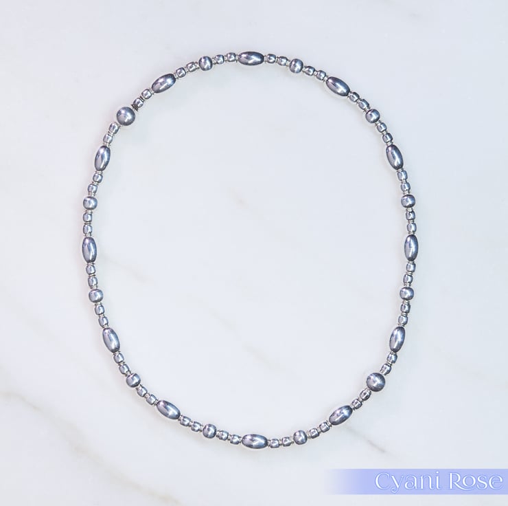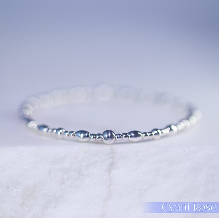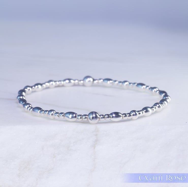 We have handmade this bracelet using sterling silver beads in a variety of shapes/sizes.