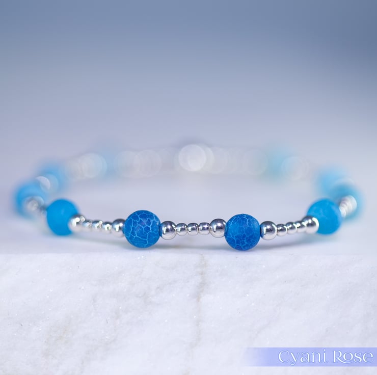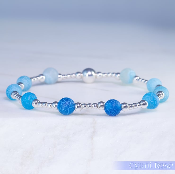 We have handmade this bracelet using 6mm crackle beads in blues and sterling silver beads 2/3/6mm.