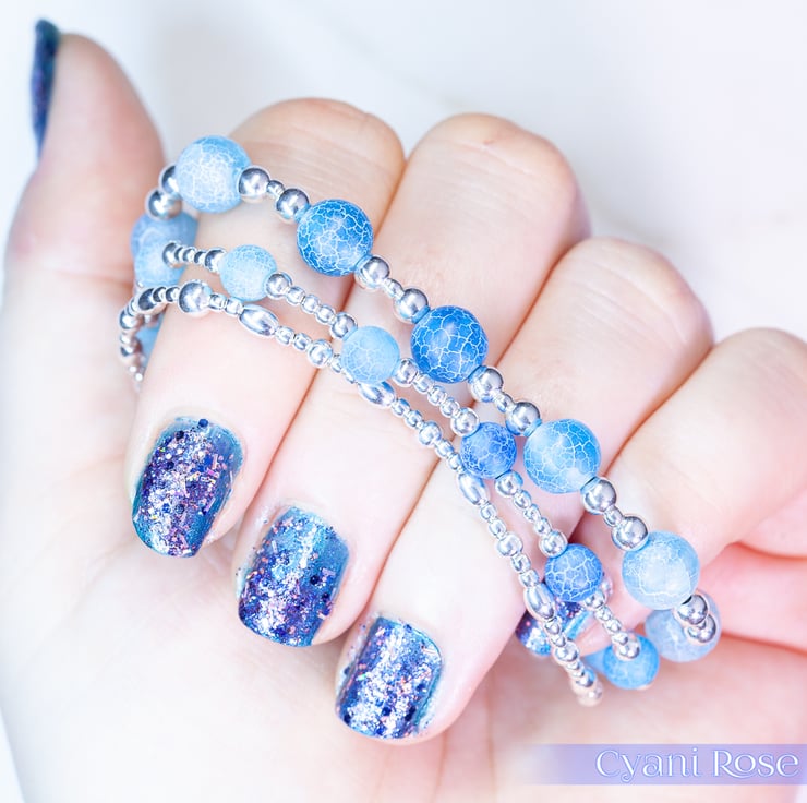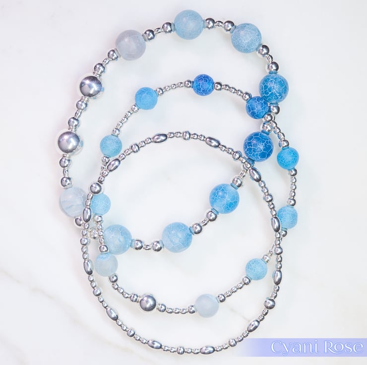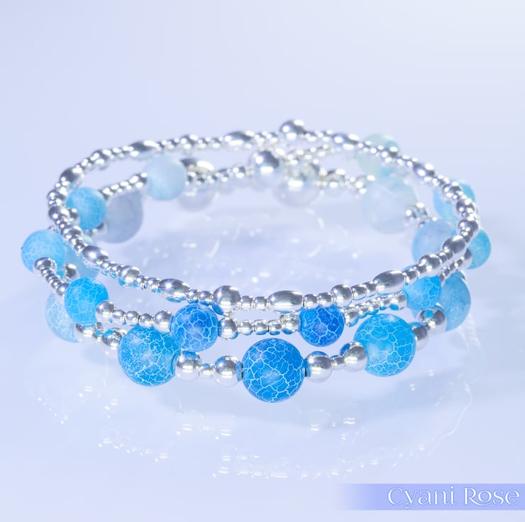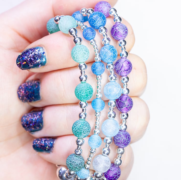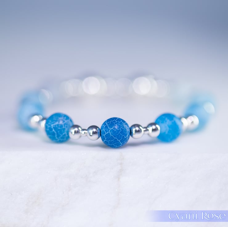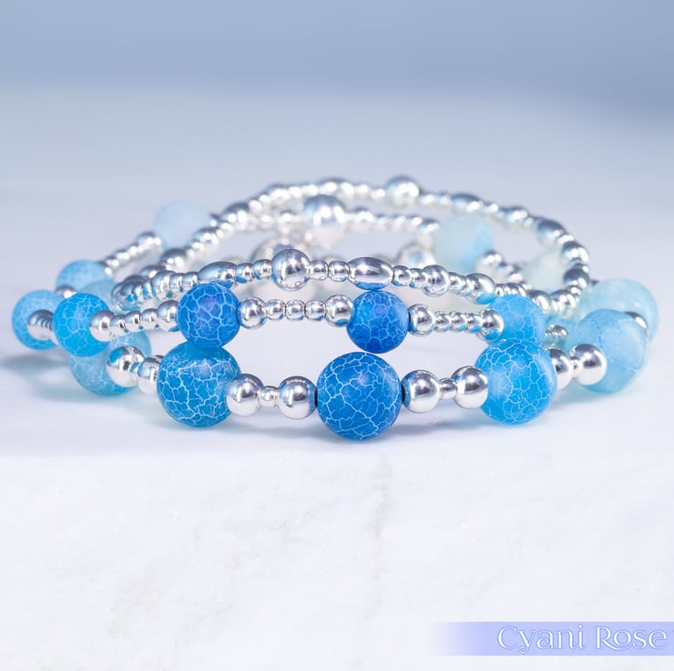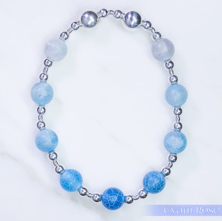 We have handmade this bracelet using 8mm crackle beads in blues and sterling silver beads 2/4/8mm.