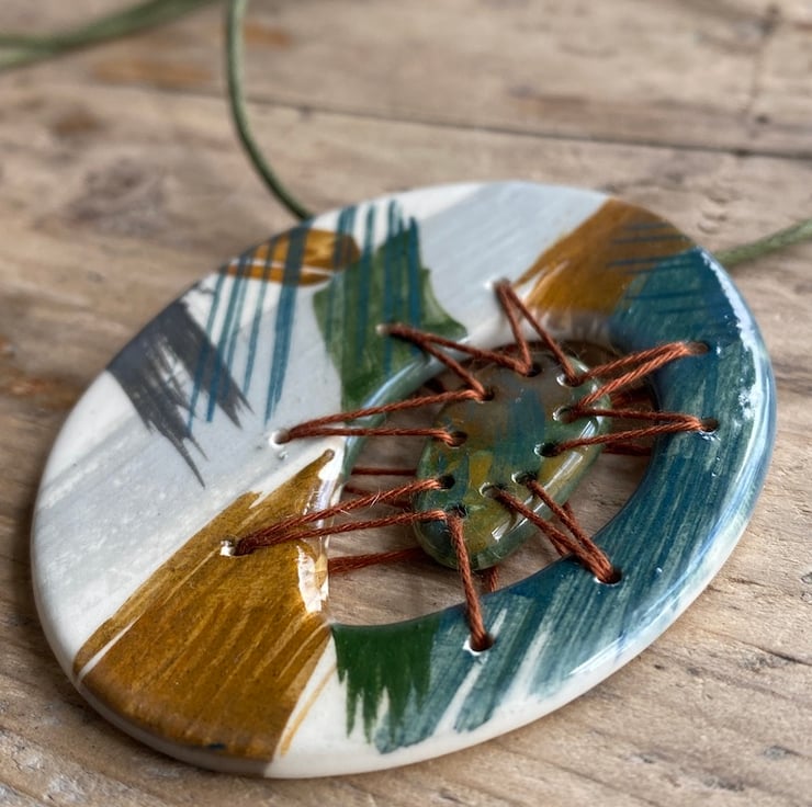 The pendant is beautifully glazed in rich Natural tones of Green, Grey, Ochre, Black and Teal.