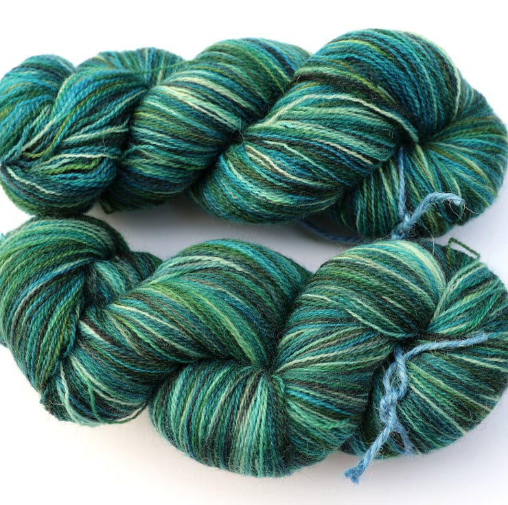 Dark greens, olive, leafy greens, teal blue, charcoal grey and cream (undyed) and everything in between. This lustrous, lofty, soft yarn should make beautiful lace projects. There is one skein left. Photographs have been taken and edited in bright natural light.