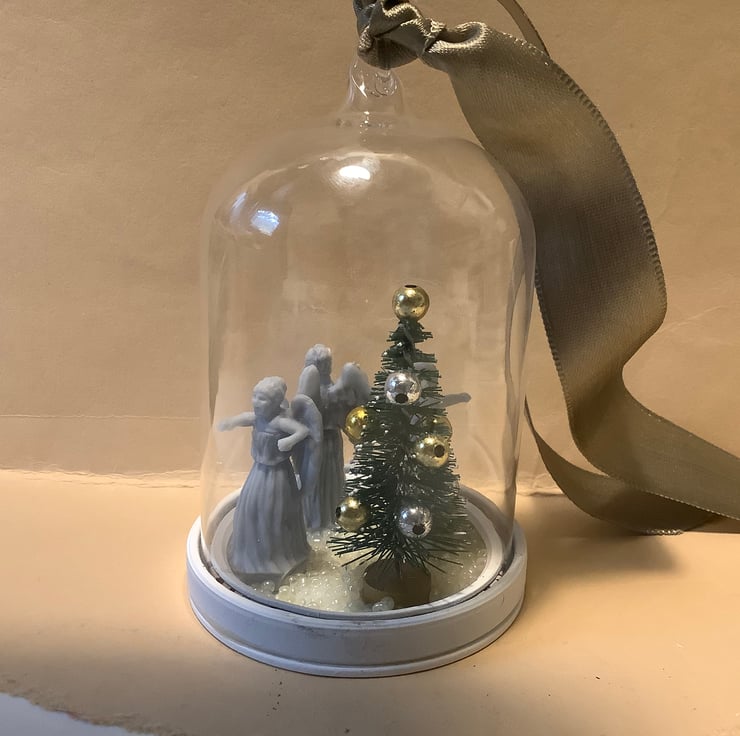 Glass bauble containing three little weeping angels and a Christmas tree.