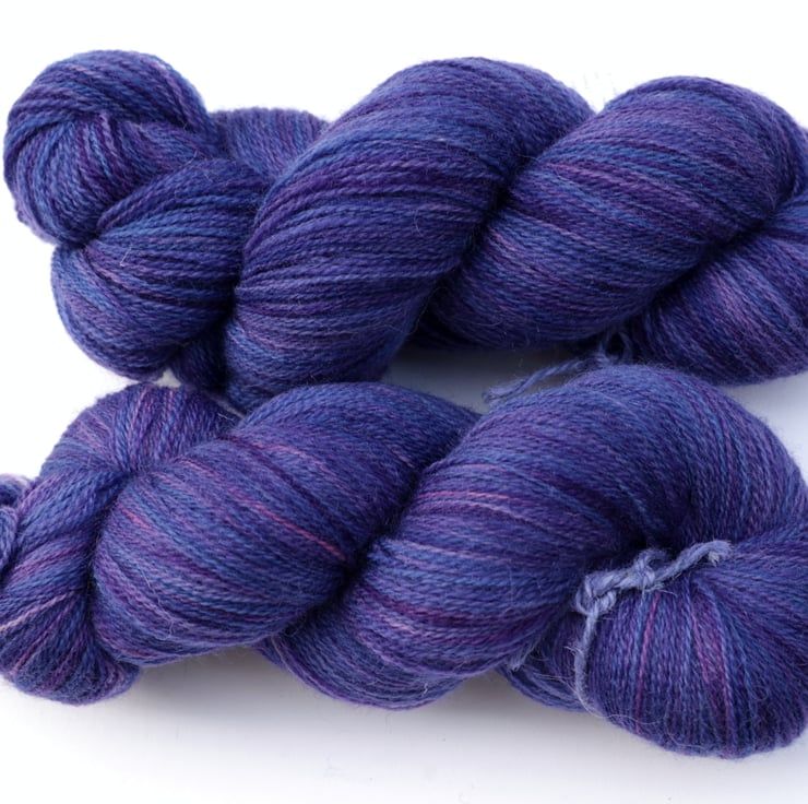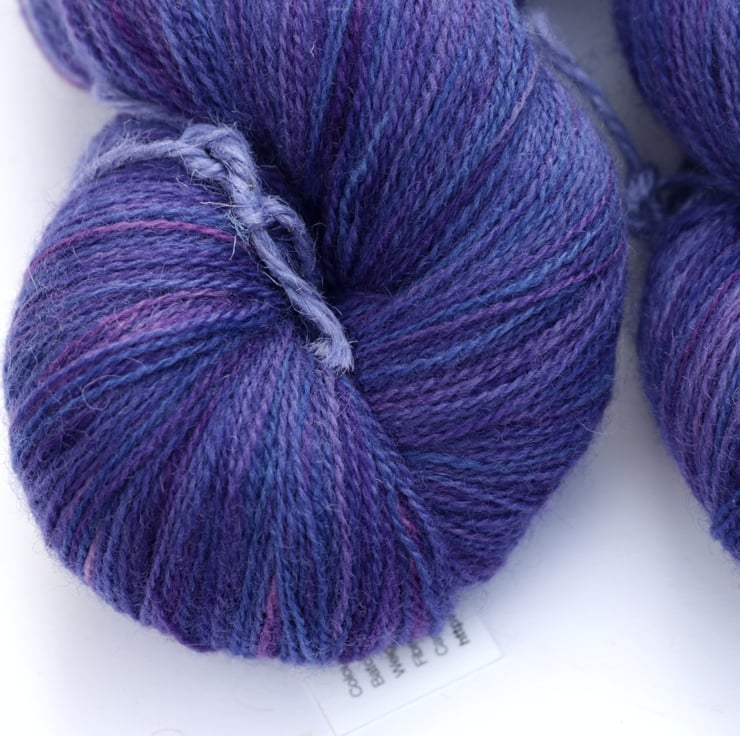 Blue-violet, violet and purple with pink hints and some lighter sections. This lustrous, lofty, soft yarn should make beautiful lace projects. There is one skein left. Photographs have been taken and edited in bright natural light.