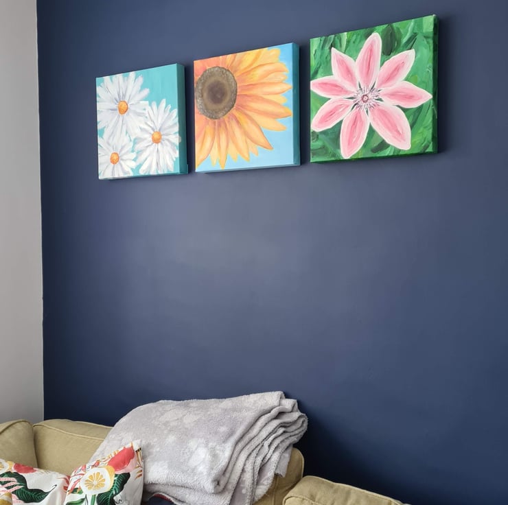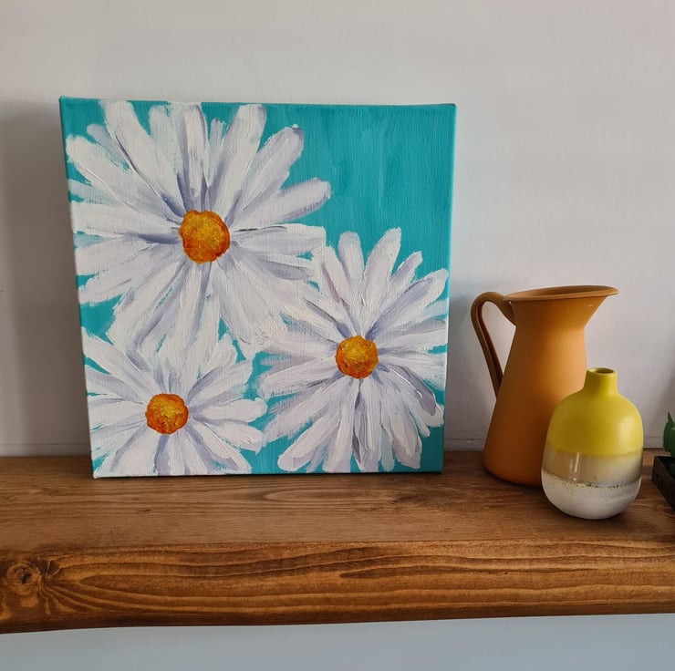 This is an original painting of three daisies on a blue/green background, painted with acrylics on a deep canvas. The painting measures approx 30x30cm and can stand on a shelf/mantel or hang on the wall. There are two other flower paintings available of the same size, so if you wanted to buy all three for a discounted price, there is a listing for 'set of three canvas paintings' in the 'multipacks at value prices' and 'original art on canvas' categories.