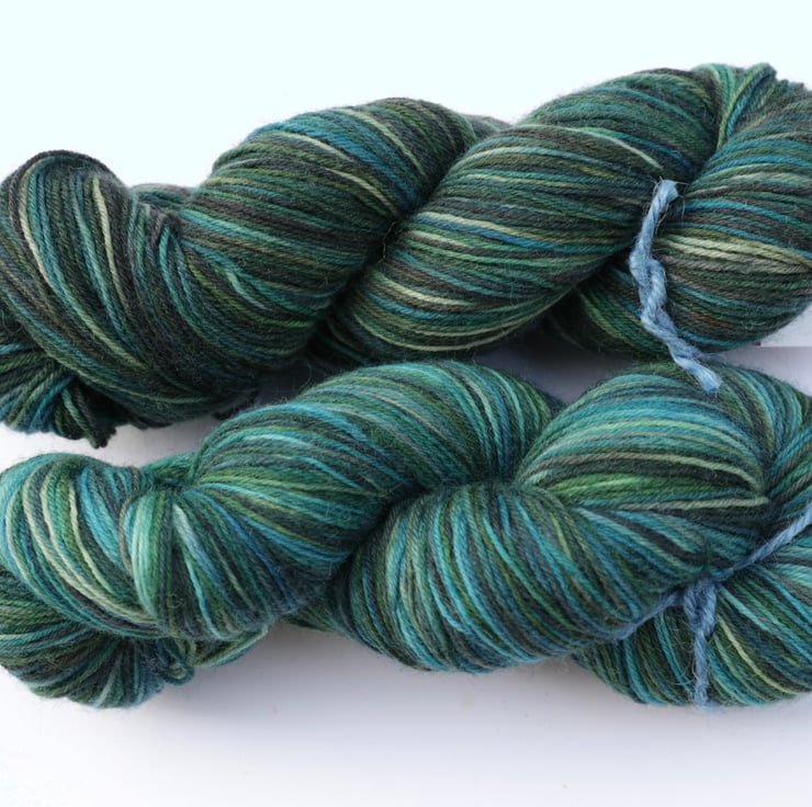 Mottled shades of dark green (almost black in some places), green, dark grey, teal blue, light green and lighter sections. This Bluefaced Leicester superwash yarn is soft with a very slight lustre. There is one skein left. It is the more blue skein as shown in the first photo and the bottom of the second photo. Photos taken and edited in bright natural light. The first photo is more accurate for colour.