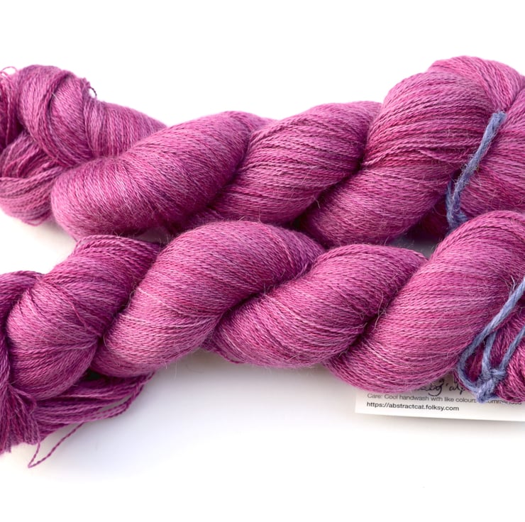 Semi-solid/subtly variegated thulian pink - pink with a slightly purple note, slightly darker and bluer than rose pink. This gorgeous and luxurious yarn has the softness and warmth of alpaca with the smooth sheen and cool feel of silk. It should make beautiful lace projects. There is one skein left. Photographs have been taken and edited in bright natural light.