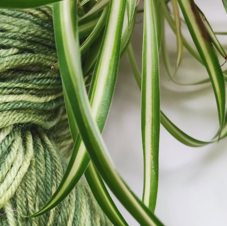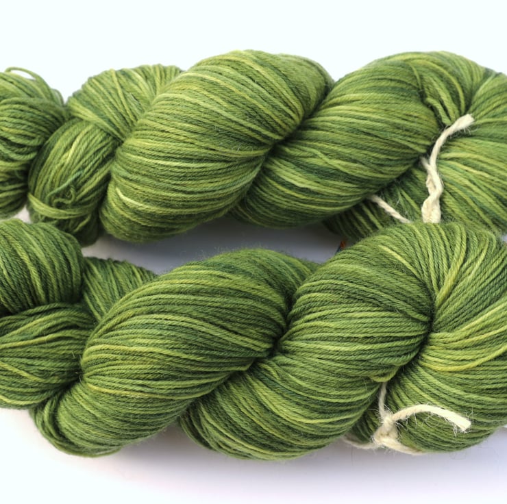 Light to mid olive greens, and very similar to the babies on the spider plant next to my desk. This Bluefaced Leicester superwash yarn is soft with a very slight lustre. There are two skeins available (price shown is for one). As always I recommend alternating skeins as you work if you plan to use both in the same project. Photos taken and edited in bright natural light.