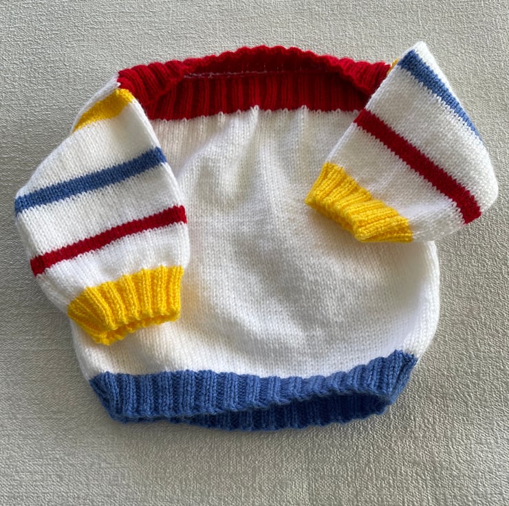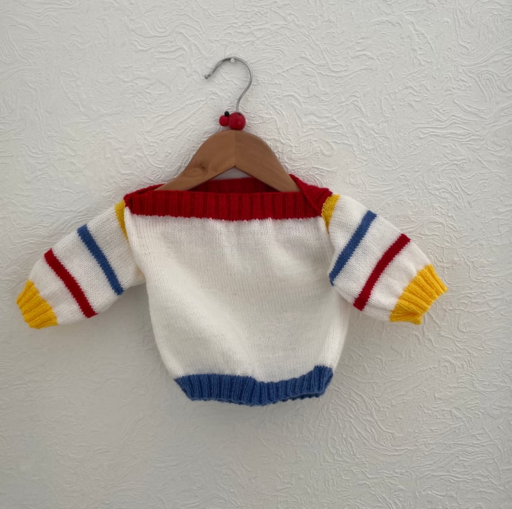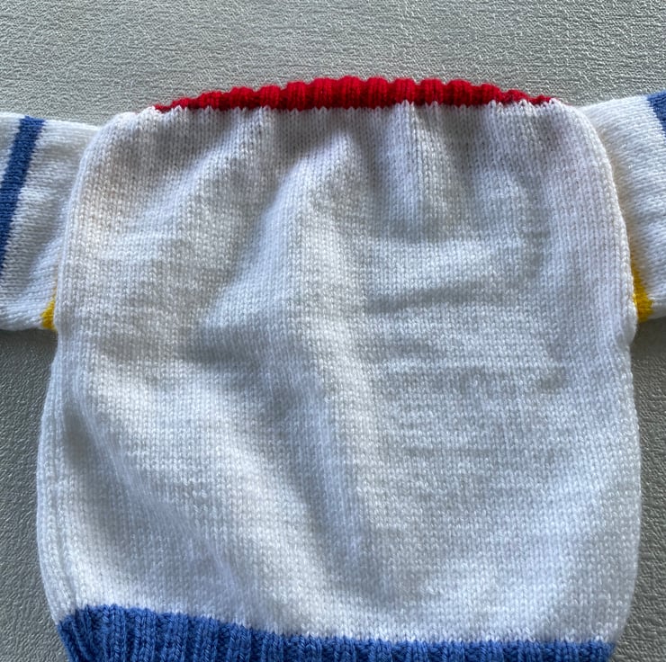 This white jumper has primary coloured stripes on the sleeves. It is hand knitted in an acrylic 4ply baby yarn. The rib at the bottom is worked in blue, the sleeve ribs are yellow and the envelope neck band is red. The sleeves have three narrow stripes in the same colours.
