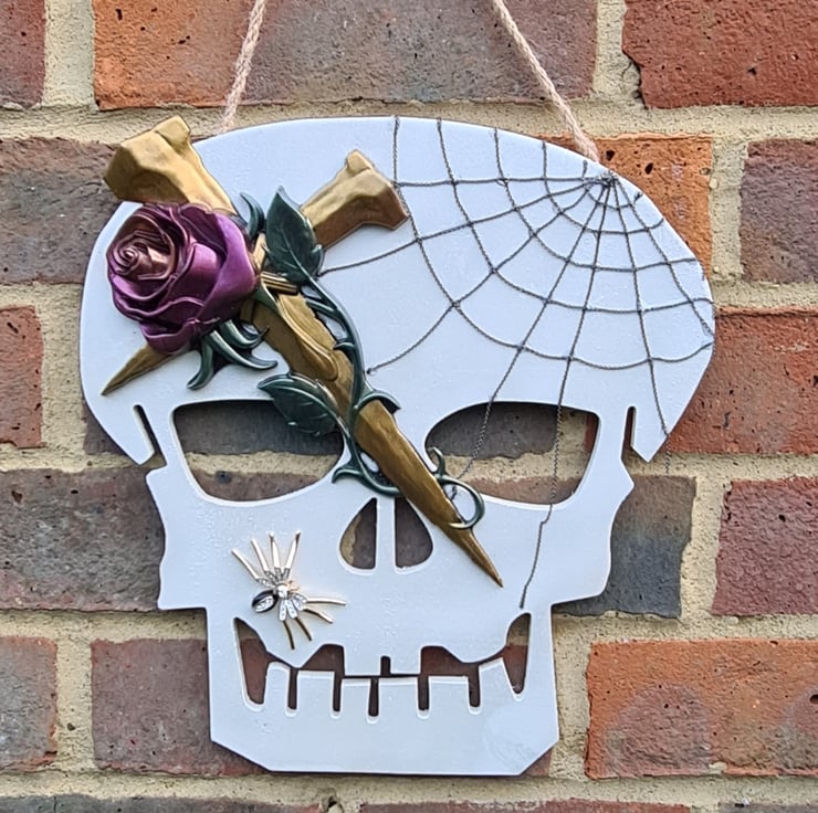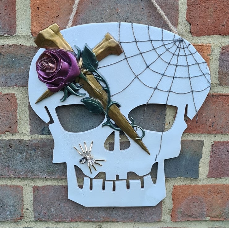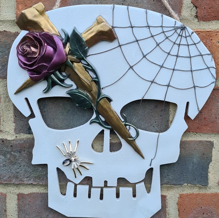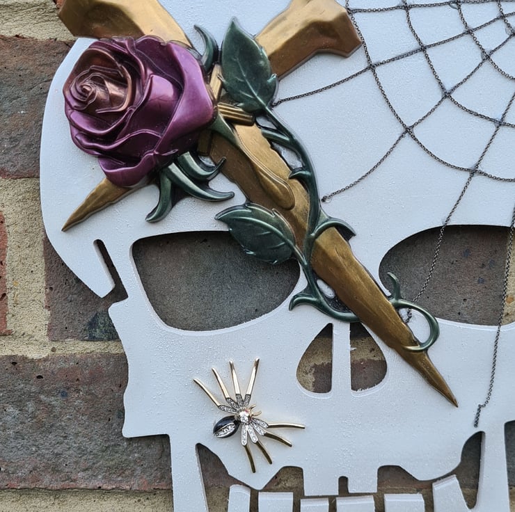 A lovely light colour Skull Wall Hanger with chain spiderweb, bejewelled spider and resin Rose/Stake design. A beautiful and unusual decorative item.