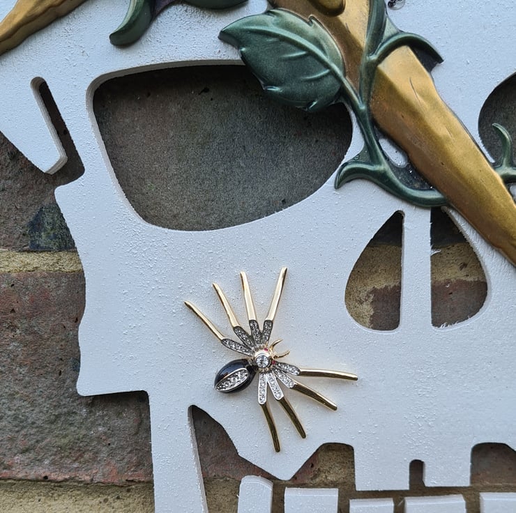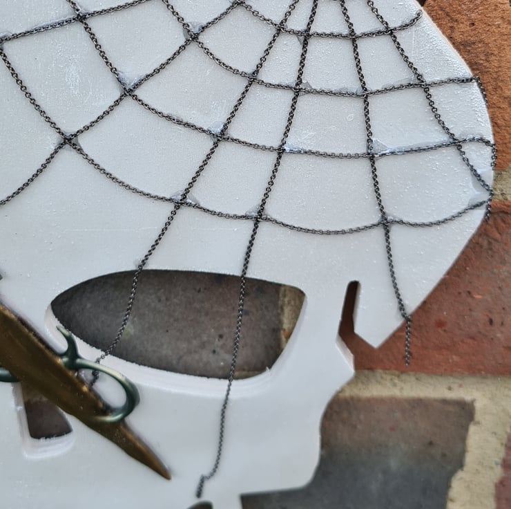 Item measures approx 29cm H x 27cm wide, Skull Plaque is wooden (back is unpainted). Front is embellished with a Resin Rose/Stake, a metal chain Spiderweb and a gorgeous repurposed Spider brooch. Comes on a Twine string so you can hang it up.