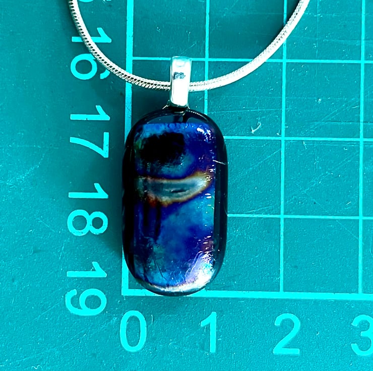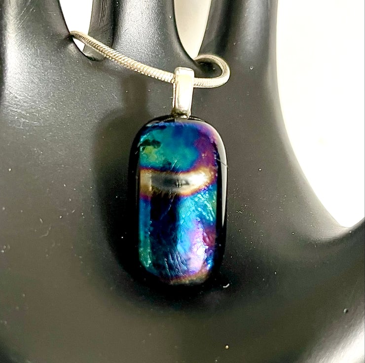 A beautiful vibrant dichroic pattern glass pill shaped pendant using hand cut glass fused at 800 degrees Celsius. Measuring approximately 12mm across and 22mm long this unique pendant is hung on an 18 inch silver plated snake chain. It’s hard to capture in a picture the subtle beauty in the colours of this glass piece, but it’s a little beauty!