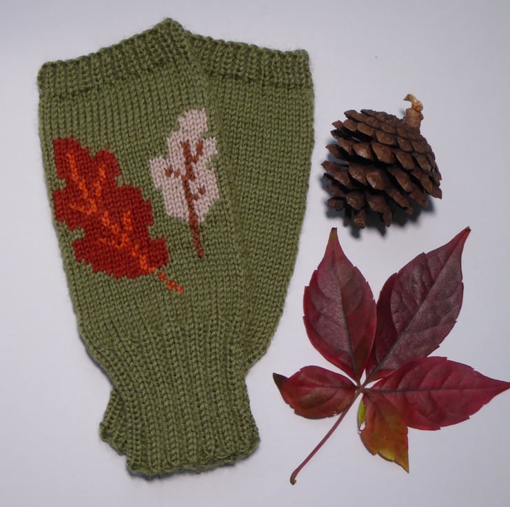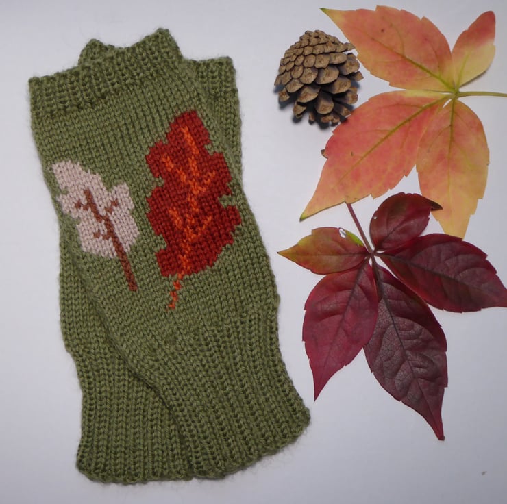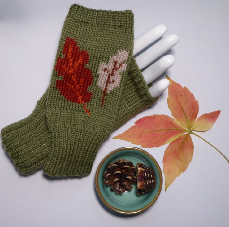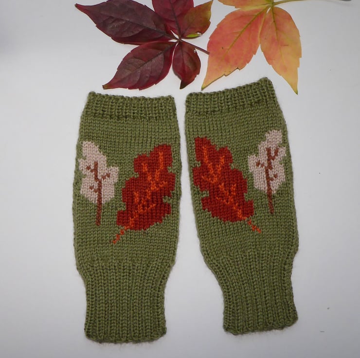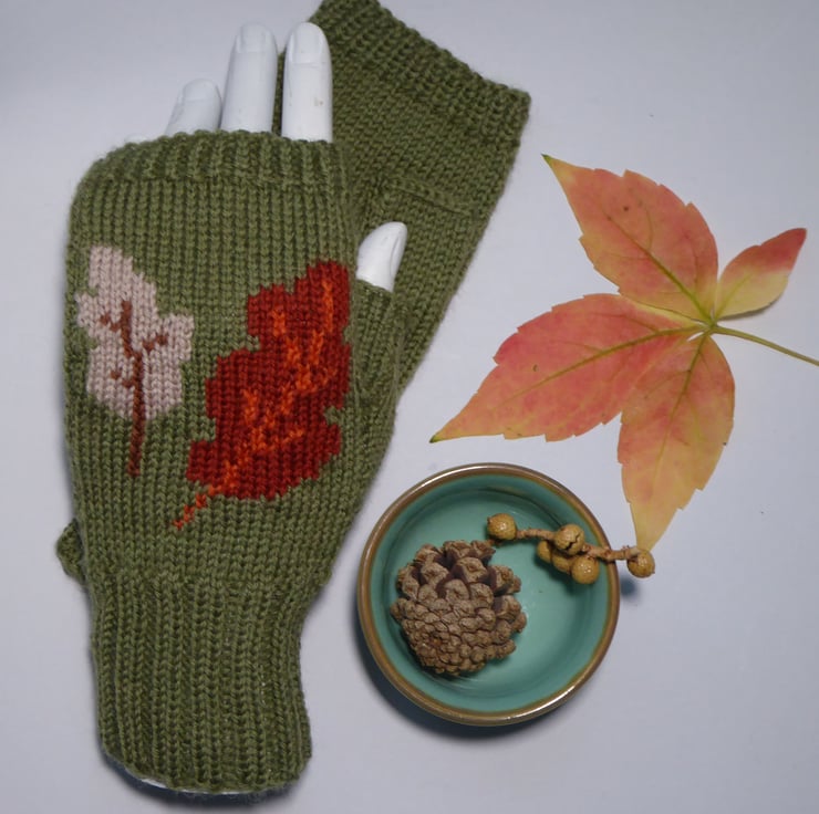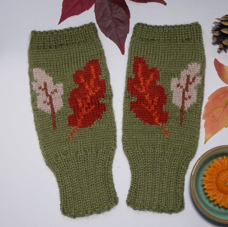 Fingerless gloves knitted in green merino wool with an autumn leaves design in beige and rust brown. These are made using the Intarsia knit method giving a bold graphic design and no wool floats to snag fingers on the inside. Warm and comfy gloves that keep your hands warm but fingers free for task. Ideal to use in a cold studio or office when you're crafting, knitting, painting, drawing, typing, walking the dog or cycling.