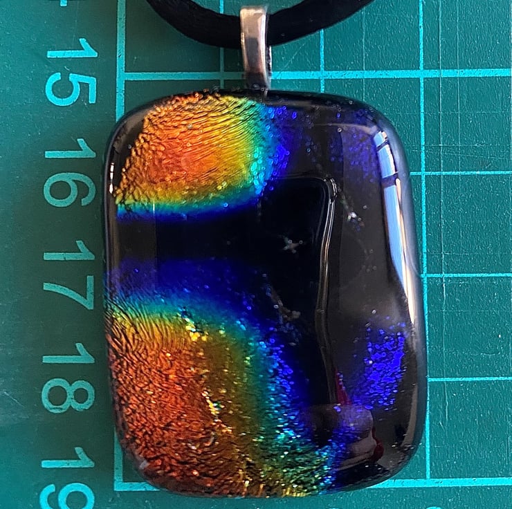 This pendant measures nearly 4cm by 3cm and is hung on black cord as pictured. It has been made with two hand cut pieces of glass. The base is a wonderful patterned shimmering dichroic glass in rainbow and black. This is capped with a clear top layer which is fused together at 800 degrees Celsius.