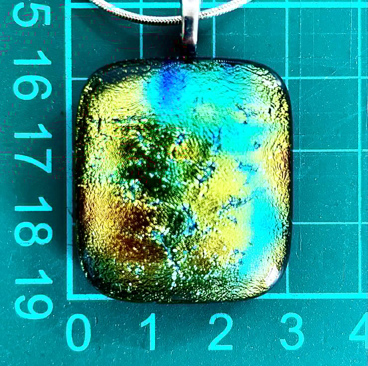 A beautiful vibrant dichroic pattern glass pendant using hand cut glass fused at 800 degrees Celsius. It's hard for the pictures to truly capture the colours of this pendant which changes when the angle of viewing changes. It's a mesmerising piece of glass which has blue, aqua, green, yellow and orange colours depending on how the light catches it.