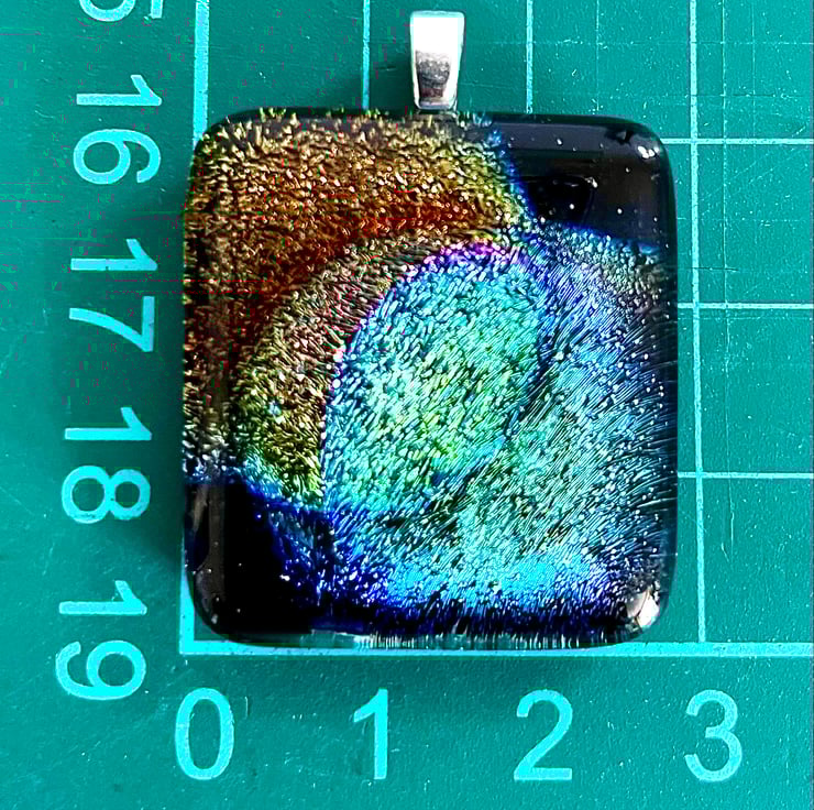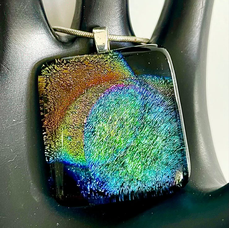 A beautiful vibrant dichroic pattern glass pendant using hand cut glass fused at 800 degrees Celsius. It's hard for the pictures to truly capture the colours of this pendant which changes when the angle of viewing changes. It's a mesmerising piece of glass in circle pattern on black which has blue, aqua, green, yellow and orange colours depending on how the light catches it.