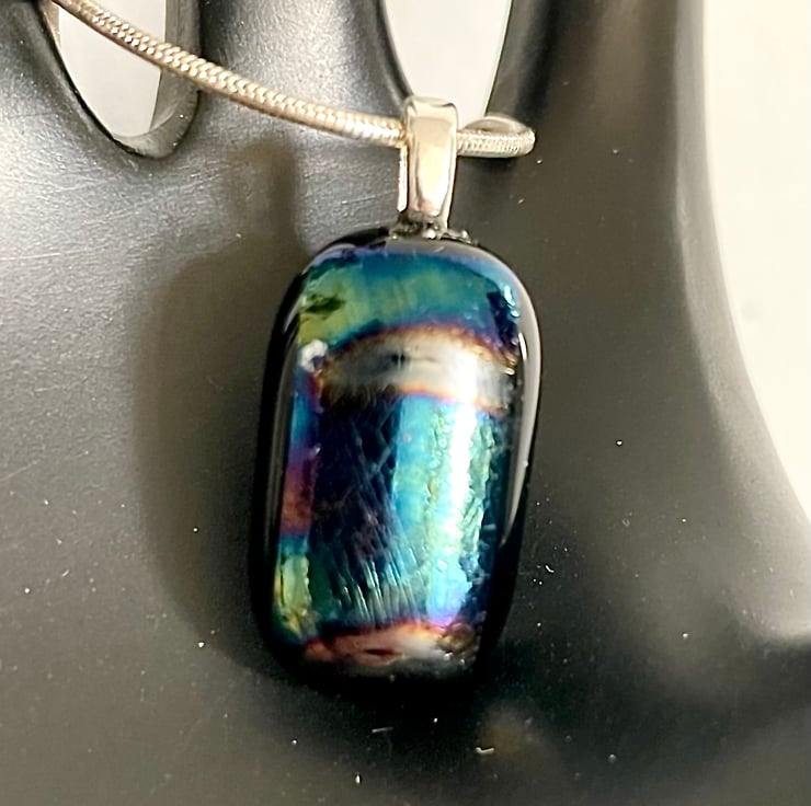 A beautiful vibrant dichroic pattern glass pill shaped pendant using hand cut glass fused at 800 degrees Celsius. Measuring approximately 10mm across and 21mm long this unique pendant is hung on an 18 inch silver plated snake chain. It’s hard to capture in a picture the subtle beauty in the colours of this glass piece, but it’s a little beauty!