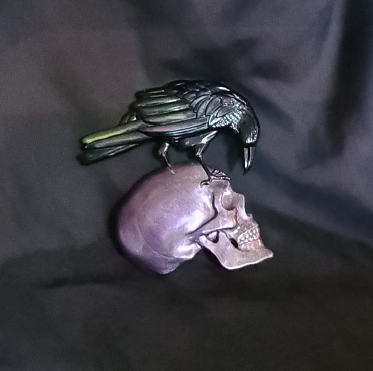 A gorgeous spooky wall plaque made of resin, depicting a Raven atop a Skull shape. A great spooky decor item for those who love skulls/crows. The skull is a lilac slightly pealised colour and the Raven is black with shimmery Purple, Green, Blue tints on its feathers.