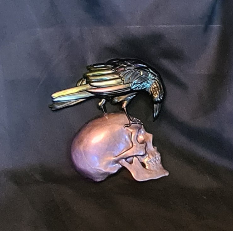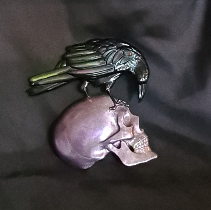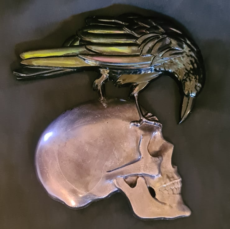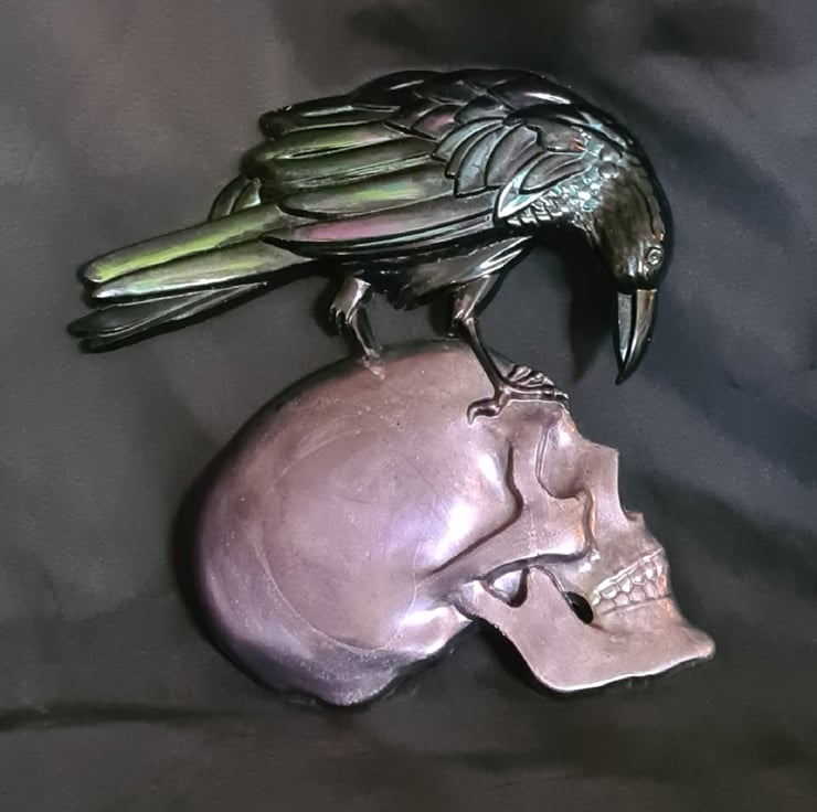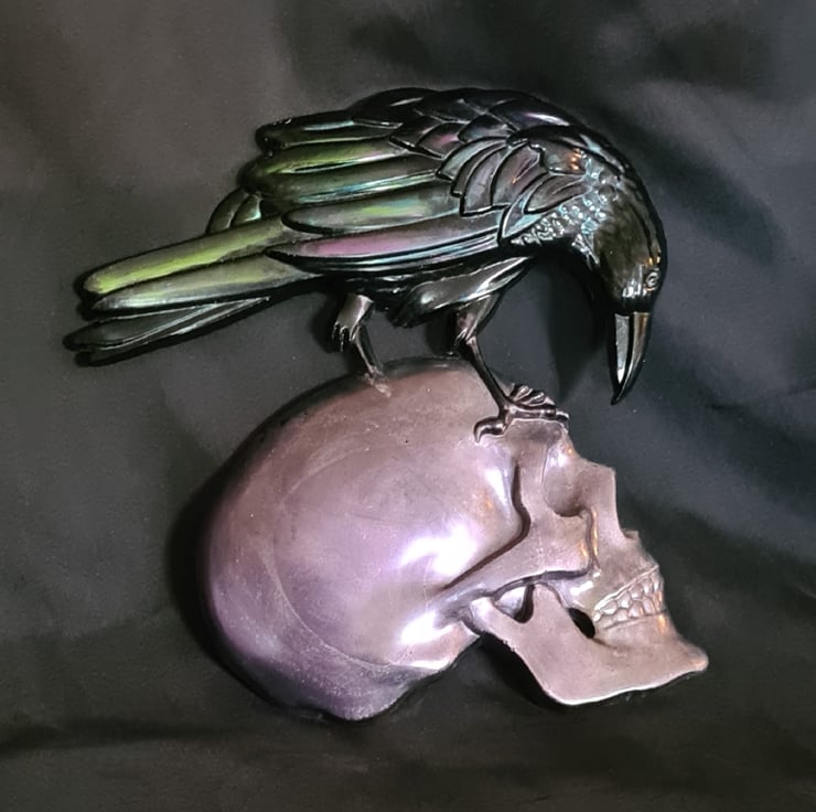 A gorgeous spooky wall plaque made of resin, depicting a Raven atop a Skull shape. A great spooky decor item for those who love skulls/crows. The skull is a lilac slightly pealised colour and the Raven is black with shimmery Purple, Green, Blue tints on its feathers.