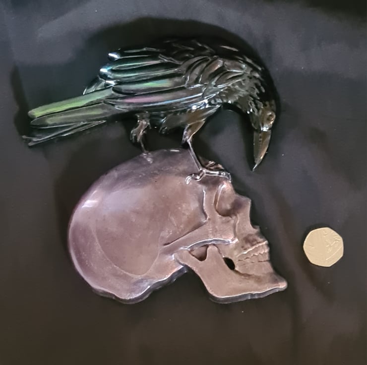 Raven/Skull Plaque is approx 19.5cm H x 18cm W (at Widest part). Made of Epoxy Resin and tinted with colourful Mica powders. Flat backed and with a D ring hook attachment so it can be hung up. Pic shows item next to 50p piece for scale purposes only!