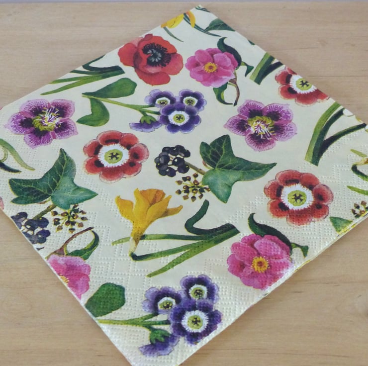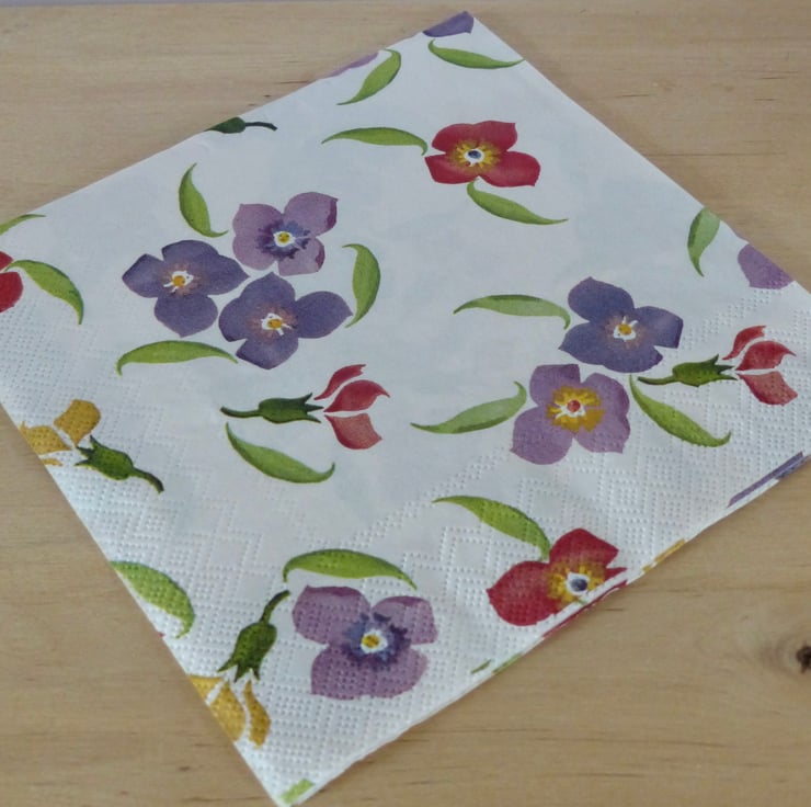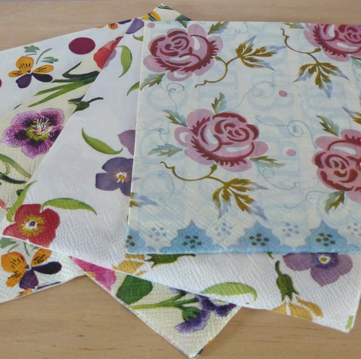 Four different 'Emma Bridgewater' 33cm paper napkins (one of each design) - Pansies & Spots, Spring Flowers, Wallflowers and Pink Roses. Ideal for craft projects, decoupage etc. They will be sent by Royal Mail packed with recycled card for protection.