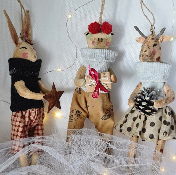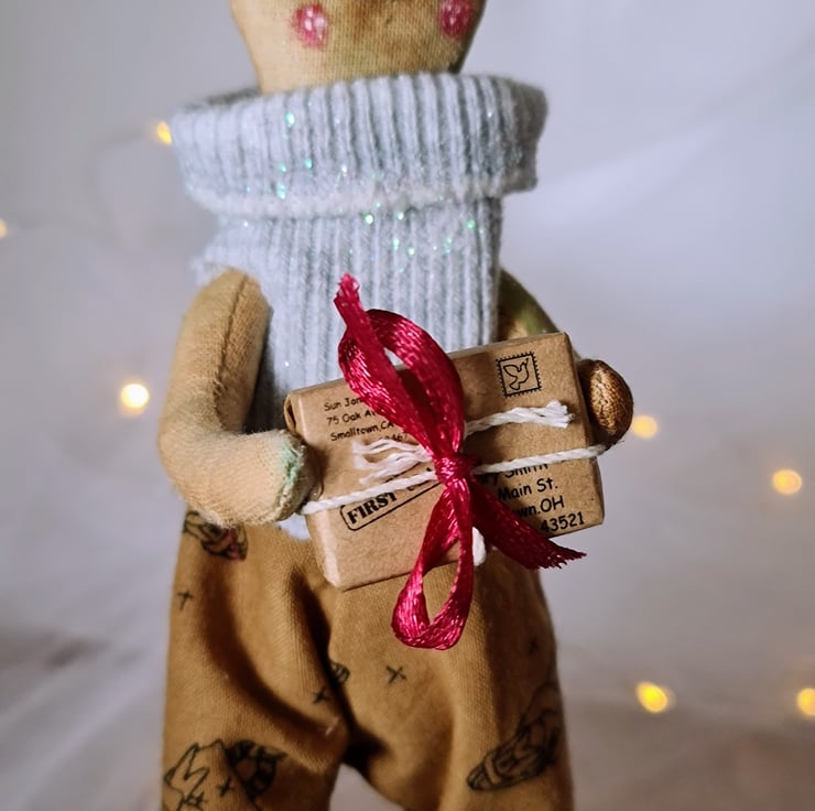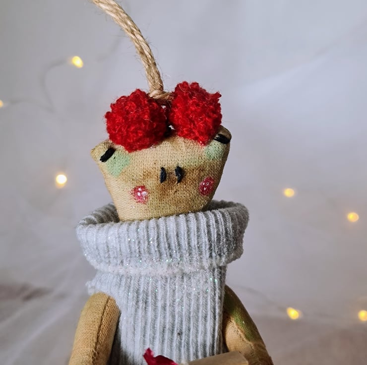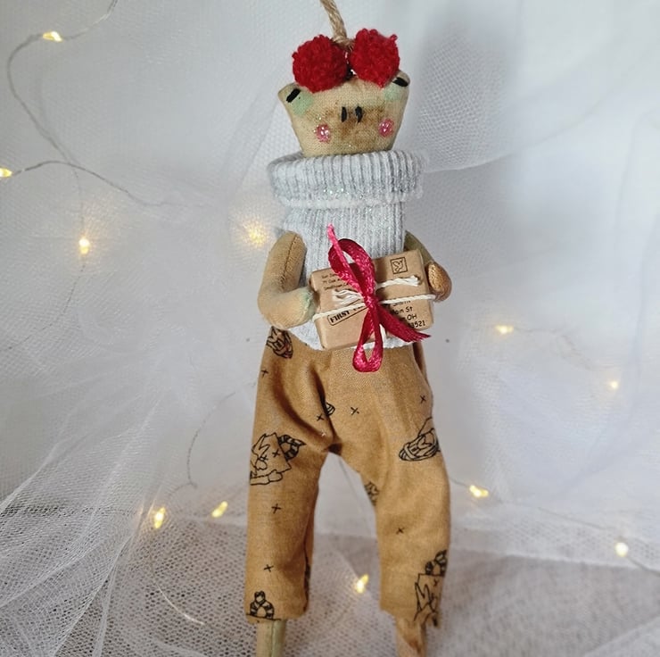 This quirky fellow is hand and machine stitched as well as hand stained and painted to look aged in un-bleached cotton. He is wearing homespun trousers, and a light powder grey jumper sprinkled with sparkles. On his head are two little maroon pom poms, and he is holding a little parcel tied with string and ribbon. He is attached to a metal hook with string for hangiing.
