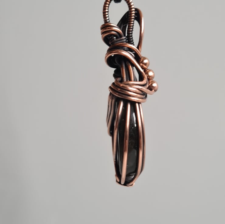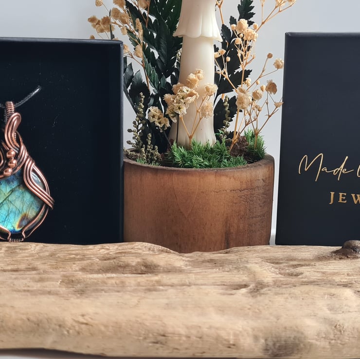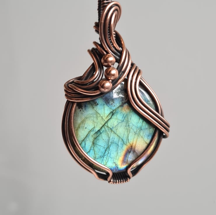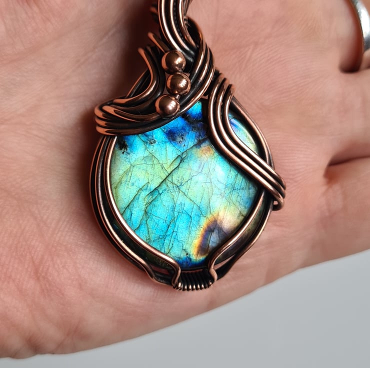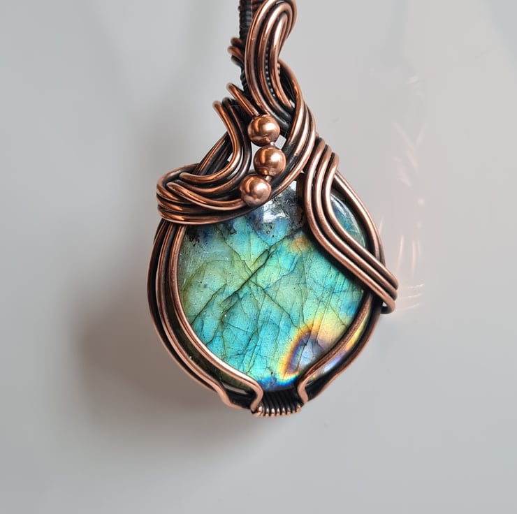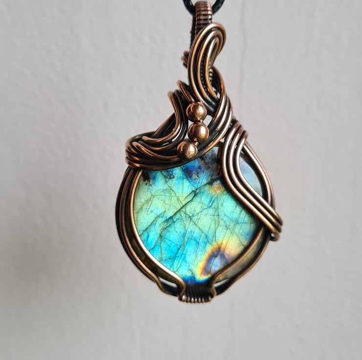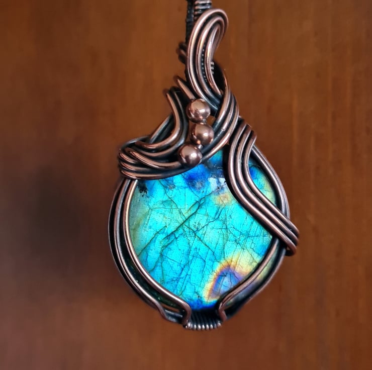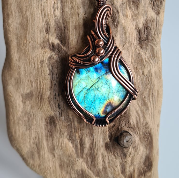 This lovely large Natural Labradorite stone is a beautiful bright blue green mix of colour with a lovely little purple flame at the bottom. I have wrapped this beautiful stone with copper into this unique design, and then antiqued and polished for the final effect. This crystal has loads of flash and colour and you can view videos of this necklace on my Facebook, Instagram and TikTok pages.