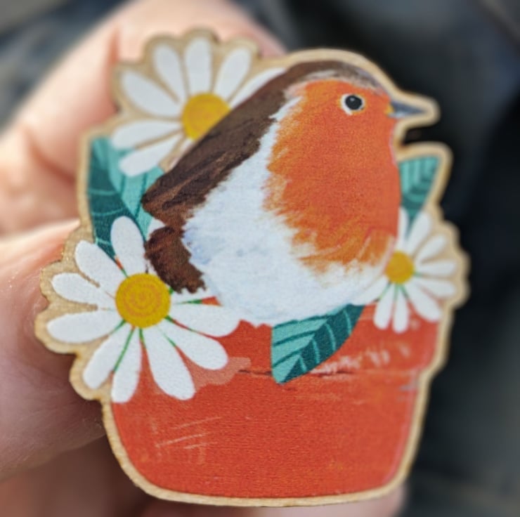 I spotted a robin on a flower pot which became a collection of Flower Pot Birds which I thought would make cute brooches. I then sourced a UK company that make them from responsibly sourced wood.