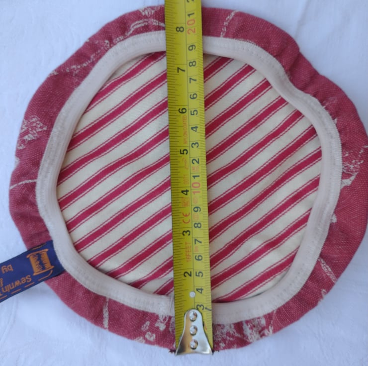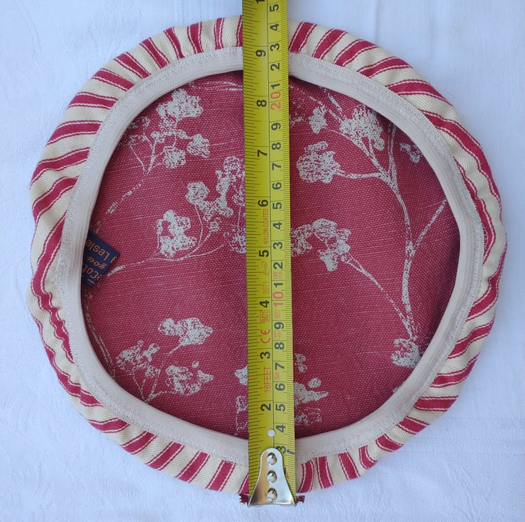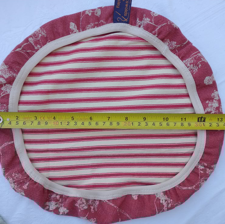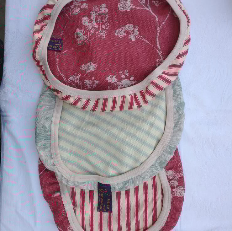 The medium covers are available in red and cream. One side is Ian Mankin Kew fabric while the other is stripped ticking. And in numerous sizes (if you're after a specific size or shape please message me).