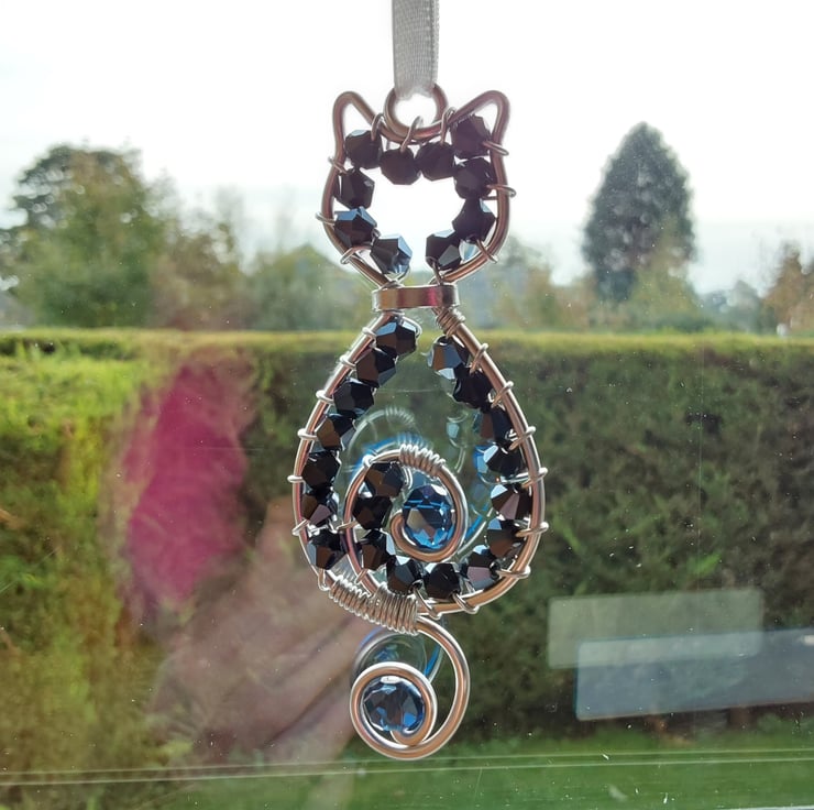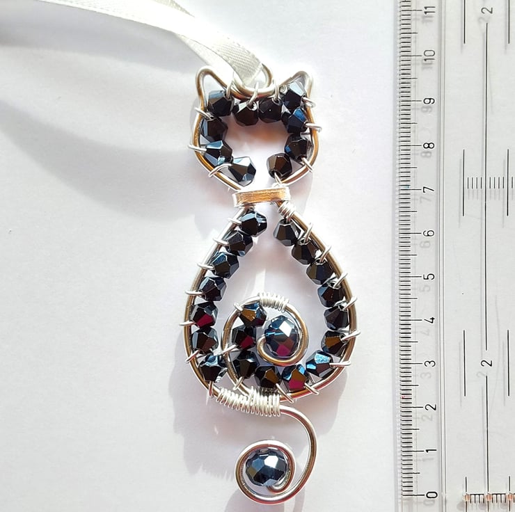 I made this cat using 2 mm thick aluminium for the frame and other aluminium to create the details. I used black bicone glass beads and black lustre 10 mm beads in the spiral detail of the body and tail. It comes with a white ribbon so it is ready to hang. It also comes gift wrapped in holographic tissue paper and arrives in a cardboard box which fits through your letterbox.