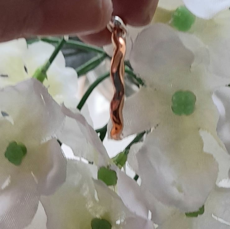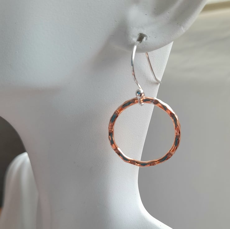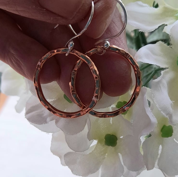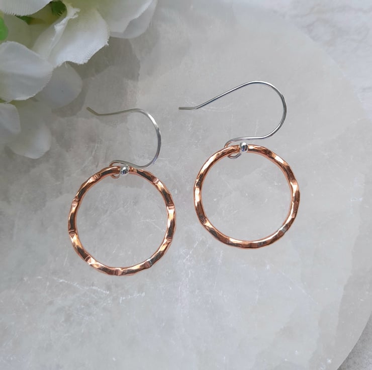 These earrings have been made with copper wire which has been formed into a circle soldered (there is a small silver line on the copper hoop where it has been soldered with silver solder) and hammered to give a wavy texture on the edge of the wire. The copper hoops have then been attached to handmade argentium silver ear wires which are hypoallergenic and have a higher silver content to sterling silver
