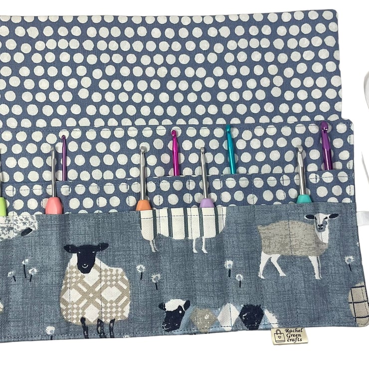 A lovely shades of blue and natural tones tartanplaid sheep fabric is the centrepiece of this crochet hook case, set on a denim blue background, I have carefully paired it with a heavierweight denim blue with white spot cotton fabric for the lining, larger pocket and inside of the flap