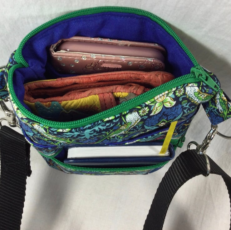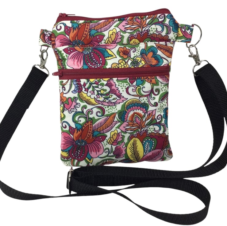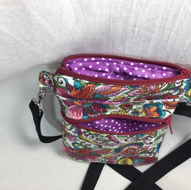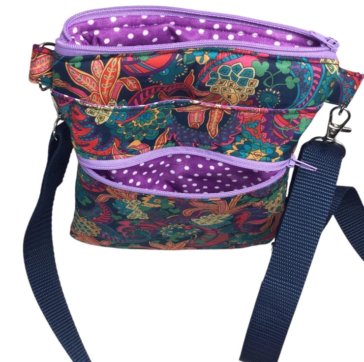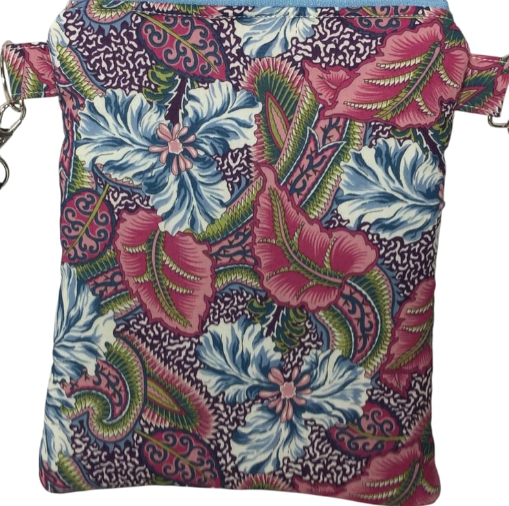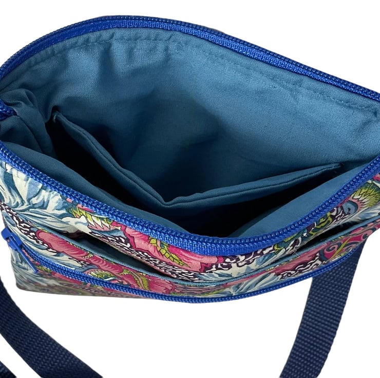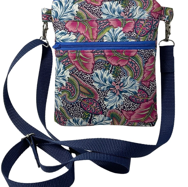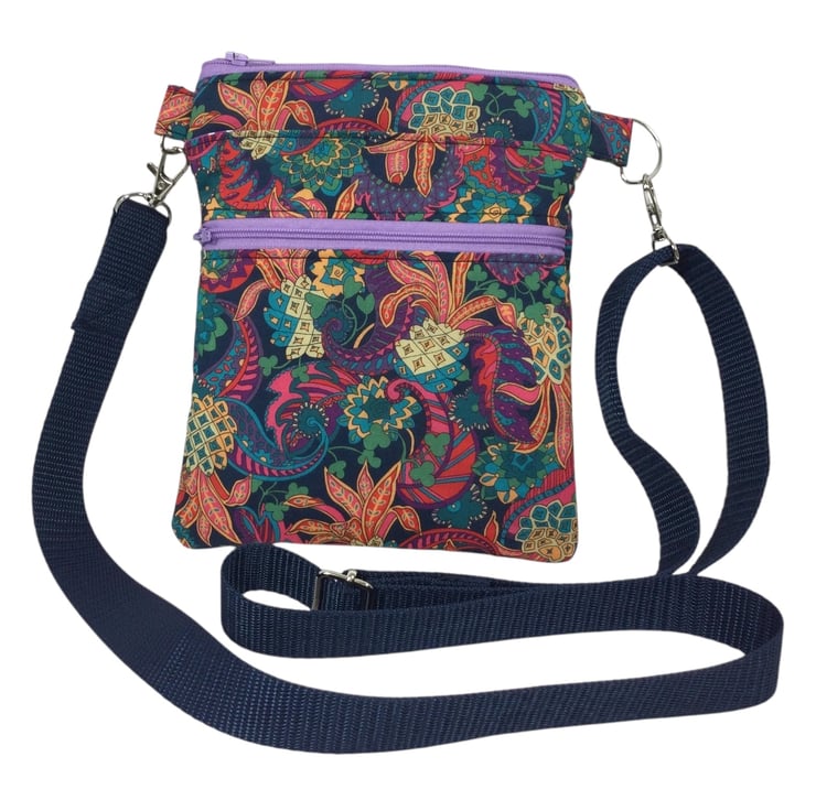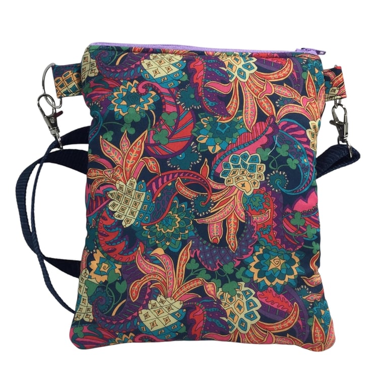 A choice of 3 oh so pretty and totally unique Liberty print small phone sized shoulder bag. Made in Liberty's luxury Tana Lawn with its almost silk like texture. This handy bag is slim, so sits close to your body, and will hold the basics when you want to grab a small bag for a trip out. I have managed to fit a purse, my phone (iPhone XS in a case) keys and a diary (shown in an alternative print bag) First we have the Gorgeous vibrant passion blooms on an off white base. Next is the stunning star burst with its intricate design in deep pink and shades of blue and finally we have pineapple paisley in jewel tones on navy blue. Passion blooms and pineapple paisley are lined in tonal violet cotton with white polka dots, while starburst is lined in smoky blue cotton.