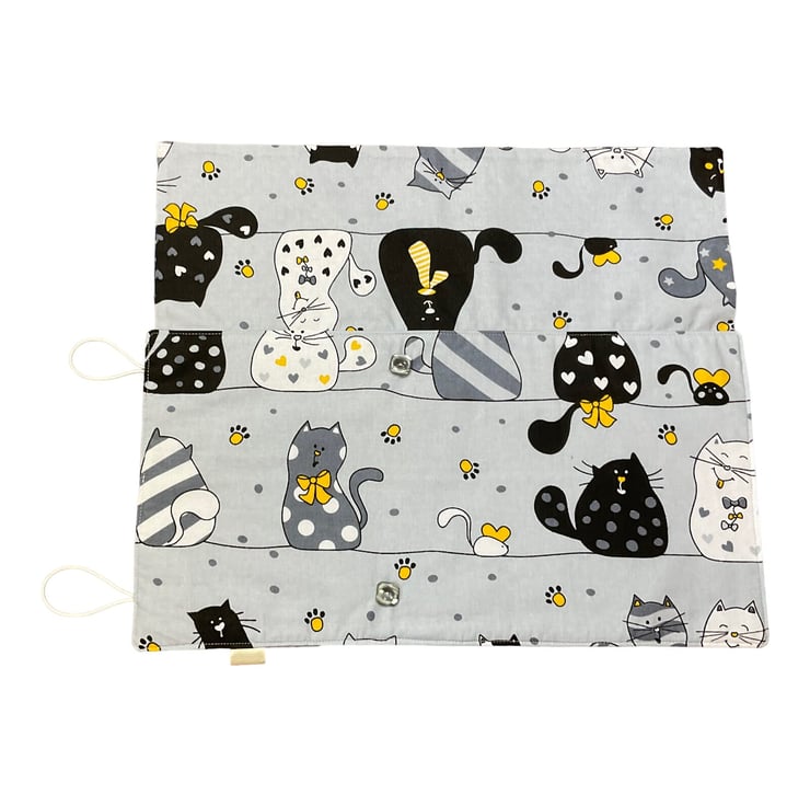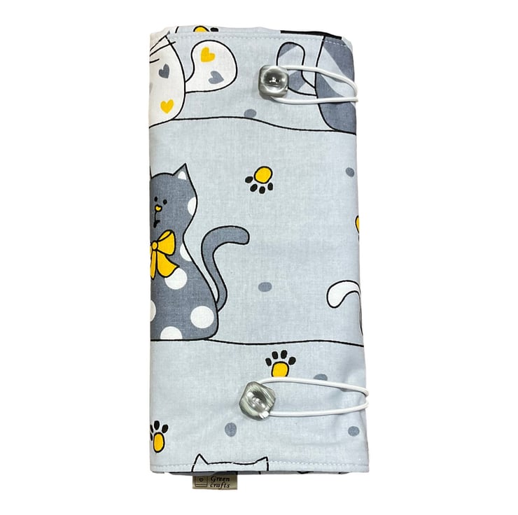 This case is made from A cute cat print fabric in shades of grey, yellow, black and white. The case can can also be used for straight needles up to 25.5cm (10") or maybe crochet hooks.